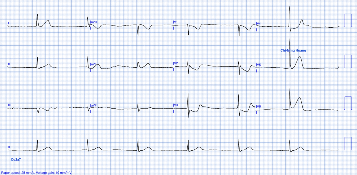 - ST- en V1-V3(V4) ≥ 0,5 mm [1], plutôt rectiligne, horizontal ou légèrement ascendant, terminé par une onde T positive (en phase précoce). Le sous-décalage peut être s’étendre au delà de V4, mais un sous-décalage maximum en V1-V4 est très spécifique d’un infarctus basal [3].