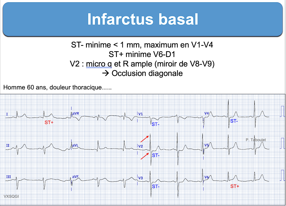 3. L’infarctus basal avec ST- en V1-V3(V4) peut renforcer aussi la reconnaissance d’une occlusion coronaire aiguë dans le territoire inférieur ou latéral quand le sus-décalage de ST est subtil.