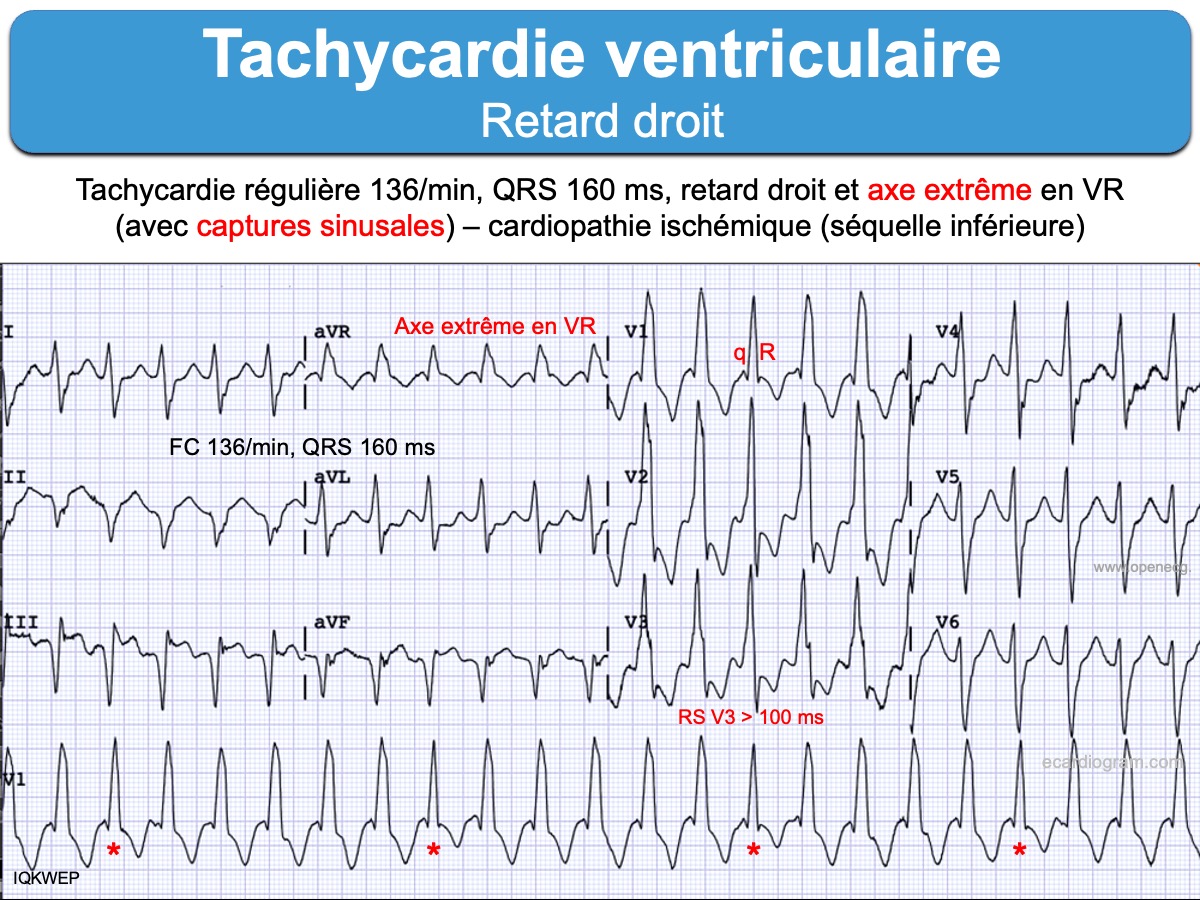Une TV avec retard droit signe une origine ventriculaire gauche (ex. TV de cardiopathie dilatée, TV ischémique, TV fasciculaire…). Une déviation axiale gauche de l’axe des QRS oriente vers la partie postéro-inférieure du VG et une déviation axiale droite vers la partie antérosupérieure du VG.