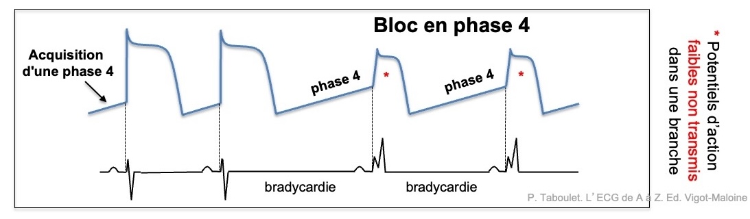 Un influx supraventriculaire tardif parvient dans une des deux branches du faisceau de His en fin de dépolarisation diastolique lente en phase 4 des potentiels d’action et ne peut engendrer des potentiels d’actions suffisants pour être propagés (cf. Loi de Weidmann). Un bloc de branche – généralement le gauche – apparaît appelé bloc en phase 4 [4]. Ce type d’aberration est en rapport avec une dégénérescence du système de His-Purkinje. Le bloc est dit « bradycardie-dépendant », car il survient lorsque le rythme cardiaque ralentit, à une fréquence basse par exemple. < 45/min) [5].