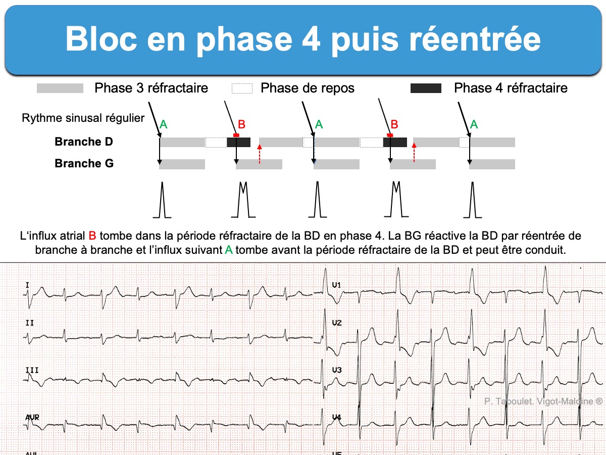 Le phénomène est le suivant : un influx supraventriculaire descend dans le faisceau de His, mais il ne peut activer qu’une seule branche (en général la droite) parce que l’autre branche est bloquée temporairement en raison d’une longue période réfractaire (par exemple, en raison d’un bloc en phase 3 ou en phase 4). Après son activation, la branche saine (A) transmet une impulsion rétrograde aux fibres septales du His, ce qui peut réactiver l’autre branche (B) si celle-ci a quitté sa période réfractaire. Cependant, cette activation précoce ne peut pas stimuler le ventricule homolatéral, toujours en période réfractaire. Elle n’a donc pas de traduction sur l’ECG (cf. conduction cachée). Quand une nouvelle impulsion supraventriculaire parvient dans le faisceau de His, la branche fraichement réactivée (B) est alors en période réfractaire et la réentrée de la branche à branche se poursuit (A vers B). Le phénomène en boucle s’interrompt lorsqu’un battement ventriculaire prématuré (ESV) survient ou que le rythme sinusal ralentit. En effet, la branche initialement bloquée (B) a le temps de sortir de sa période réfractaire, ce qui fait disparaître le bloc.