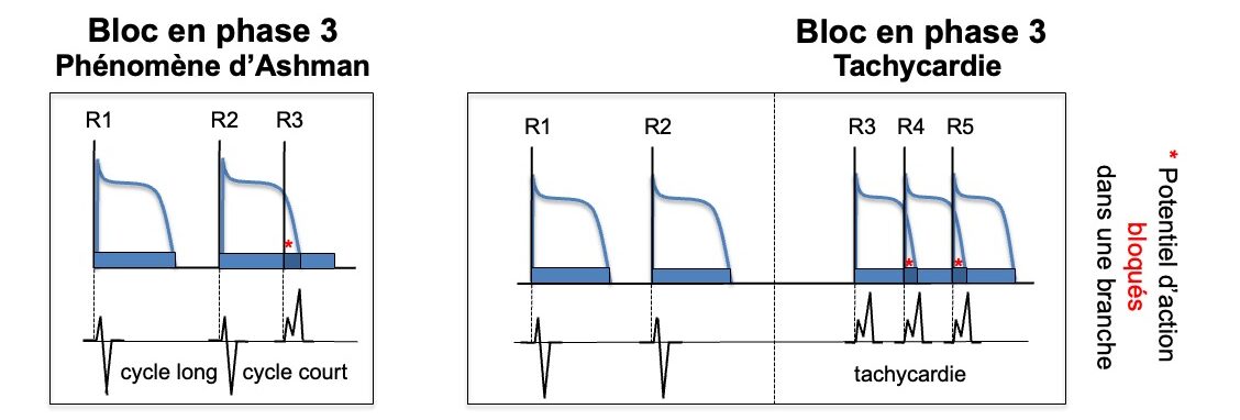Un influx supraventriculaire prématuré parvient dans une branche du faisceau de His et/ou un faisceau de la branche gauche encore en période réfractaire, en phase 3 des potentiels d’action. L’influx est alors non propagé dans la branche concernée et un bloc de branche ou un bloc fasciculaire apparaît appelé bloc en phase 3 [3]. Il est dit tachycardie-dépendant, car (a) il survient au décours d’une prématurité atriale ou jonctionnelle unique (cf. Phénomène d’Ashman) ou au cours d’une accélération soutenue de la cadence cardiaque et (b) disparaît à une fréquence moindre [5].