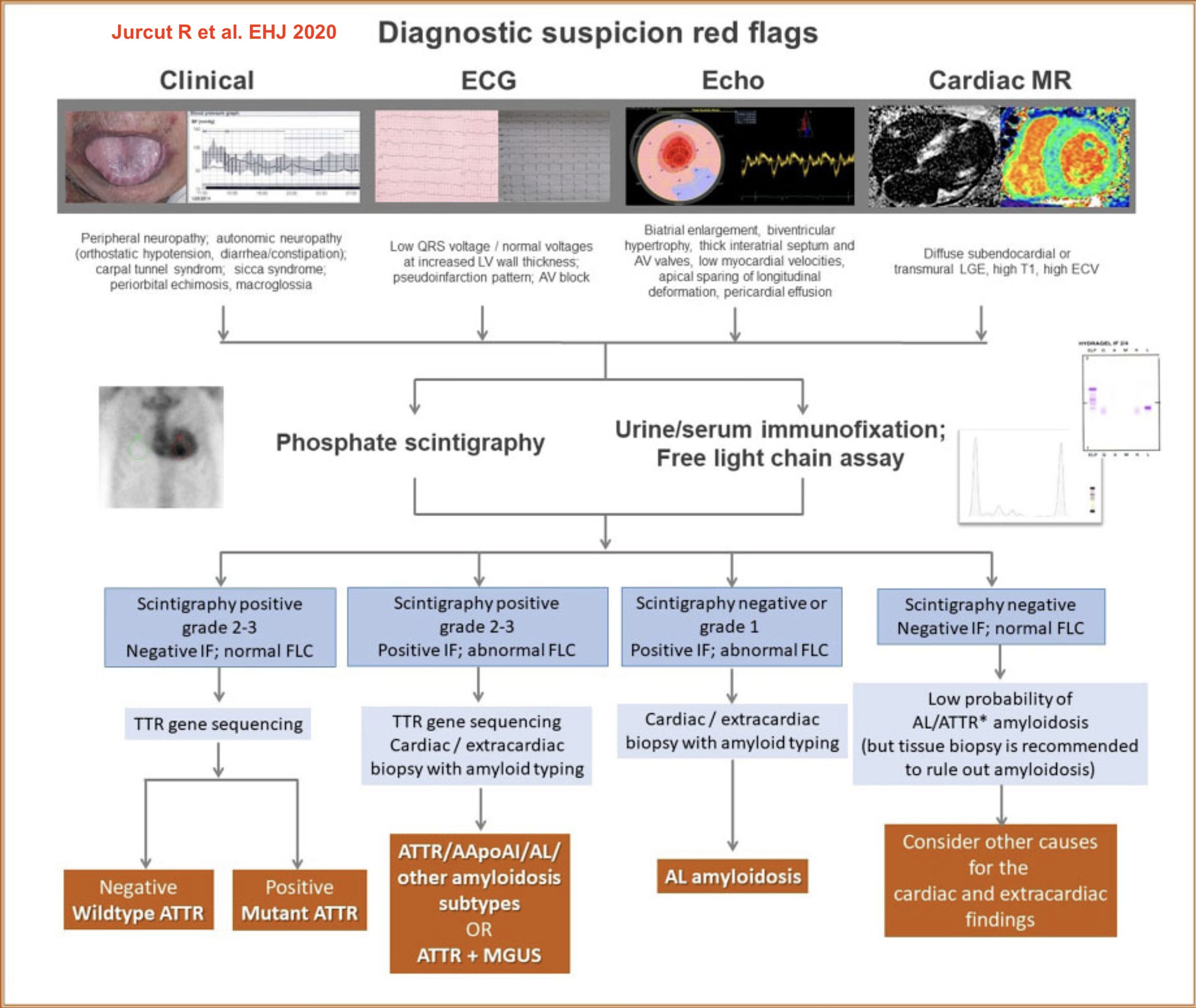 En deuxième intention, une électrophorèse avec immunofixation des protéines (S et U) à la recherche d’une gammapathie monoclonale (light-chain amyloid AL) et une scintigraphie osseuse aux diphosphonates (à la recherche d’une amylose TTR diffuse),