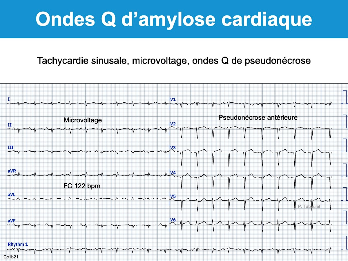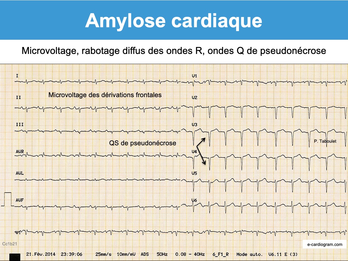 On peut évoquer une amylose devant un pattern typique associant un microvoltage, un rabotage des ondes R de V1 à V4 et/ou des ondes q de pseudo-nécrose (« pseudo-infarct pattern« ). Ces signes manquent 1 fois sur 2 [1][2][3][4]. Fait notable, ces signes sont discordants avec l’échocardiographie qui montre des signes francs d’hypertrophie ventriculaire.