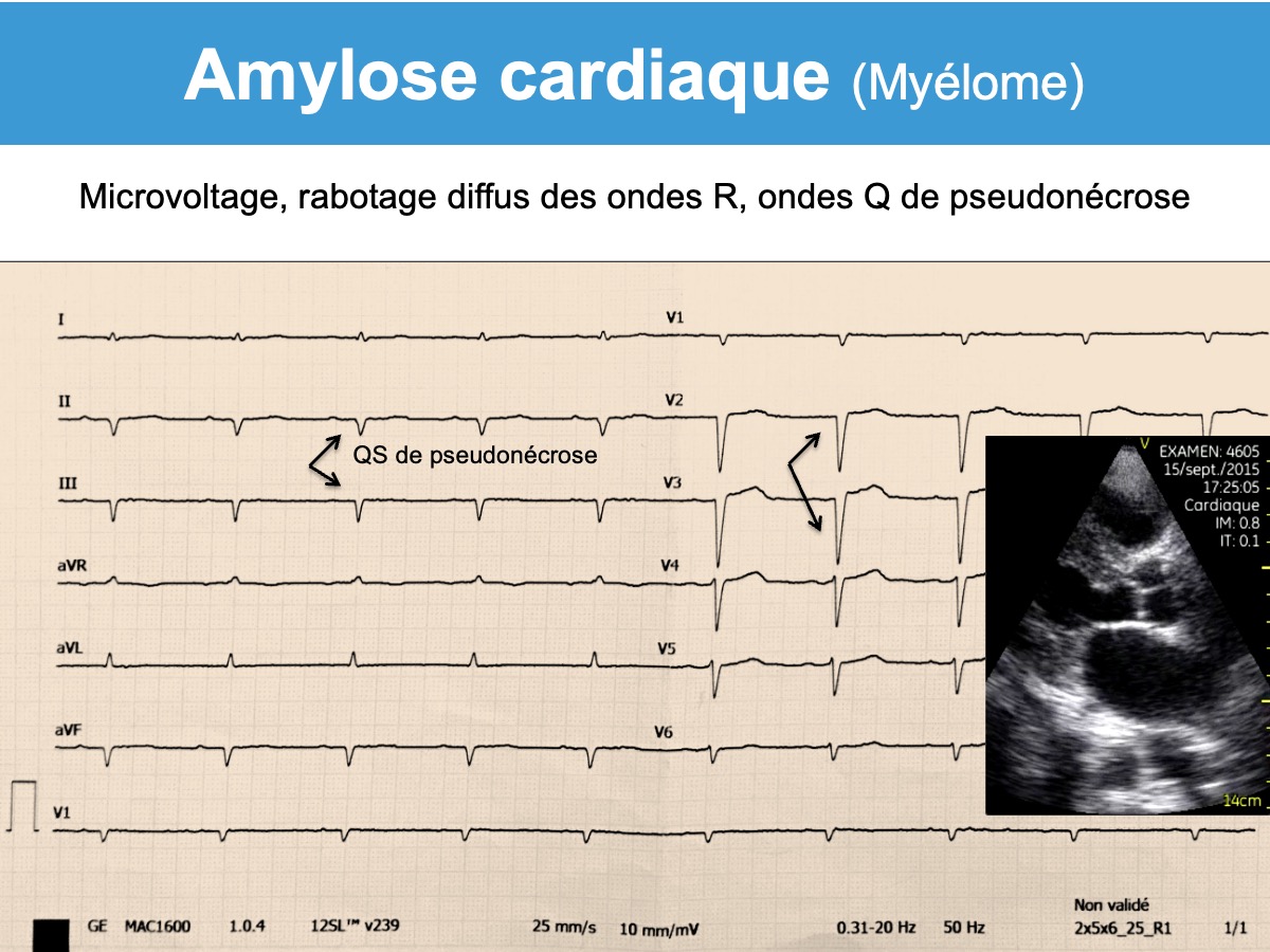 - ou devant des signes cardiologiques (ex. hypertrophie ventriculaire sévère en échocardiographie ou pattern ECG) qui font rechercher une amylose.
