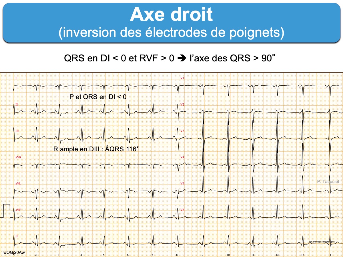 Axe des QRS entre 120 et 180° (QRS positifs en DIII avec R DIII > R VF et QRS positifs en VR à partir de 150°) [1].