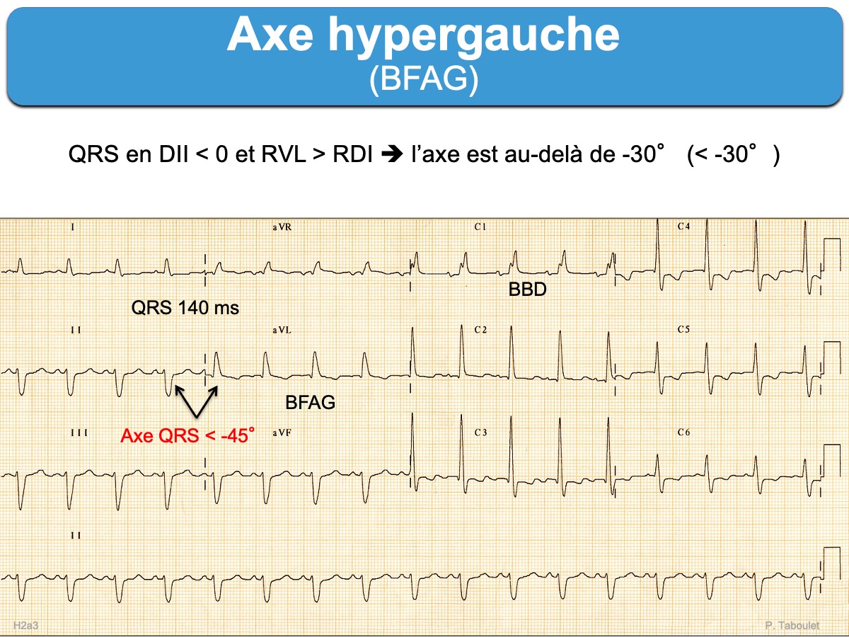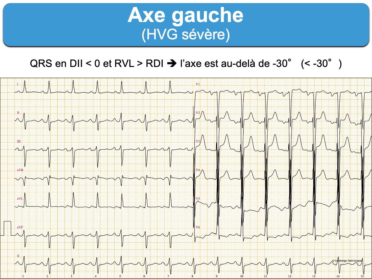 Axe des QRS (ou axe électrique du cœur) dirigé dans le plan frontal en haut à gauche au delà -30°. Il est le plus souvent pathologique. Un axe gauche, lorsqu’il est confirmé, doit faire rechercher une pathologie qui amplifie la dépolarisation latérale du ventricule gauche.