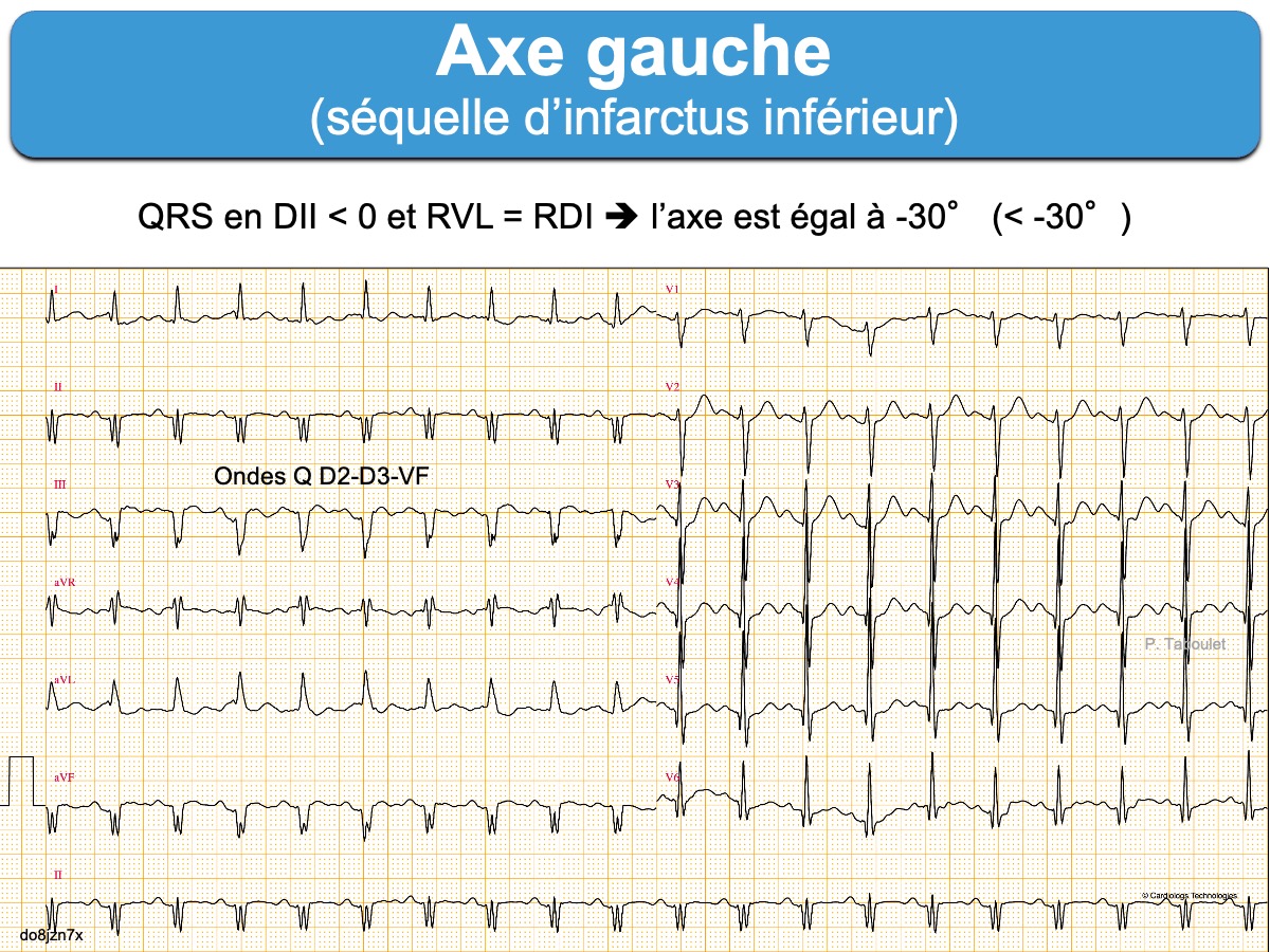 - Sinon, un axe gauche doit faire rechercher un bloc fasciculaire antérieur gauche au-delà de -45°, une préexcitation ou une séquelle d’infarctus dans le territoire inférieur.
