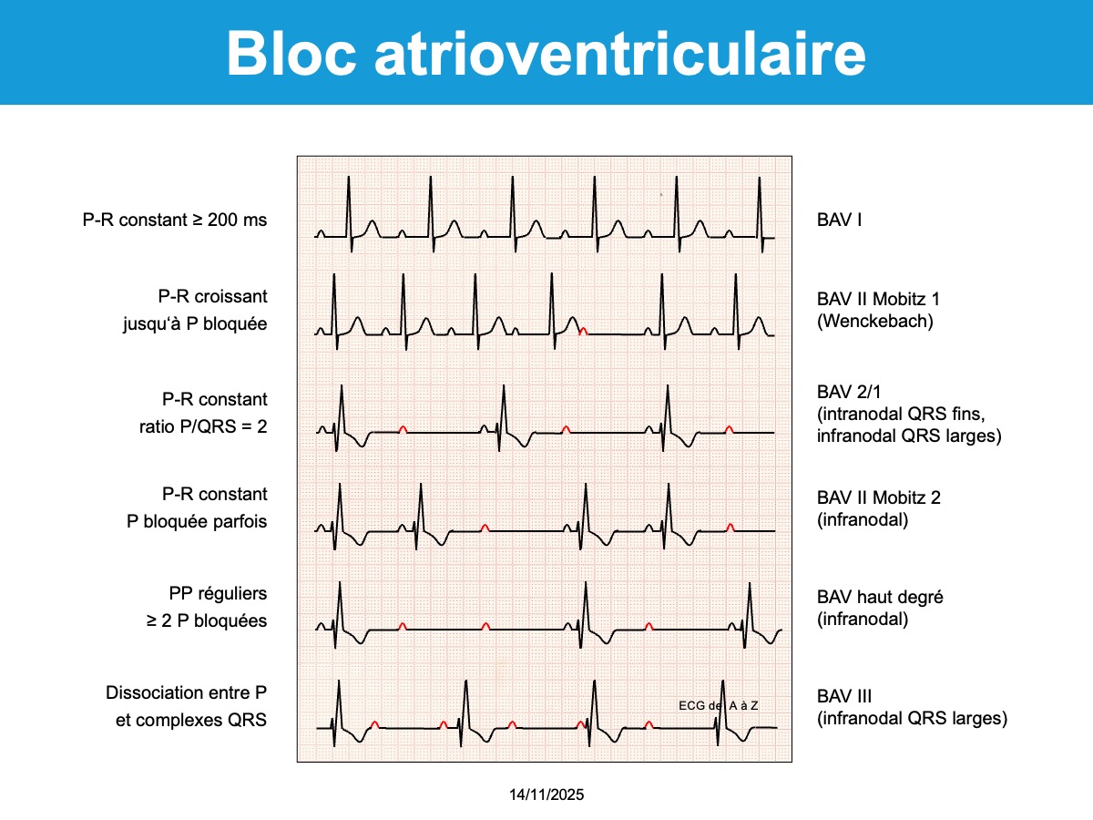 Un bloc AV peut être fonctionnel (temporaire, lié à la fréquence) ou lésionnel (définitif, indépendant de la fréquence). Il s’observe au cours des tachyarythmies, au cours desquelles le nœud AV est bombardé par des influx et exerce un rôle frénateur lié à sa conduction décrémentielle.