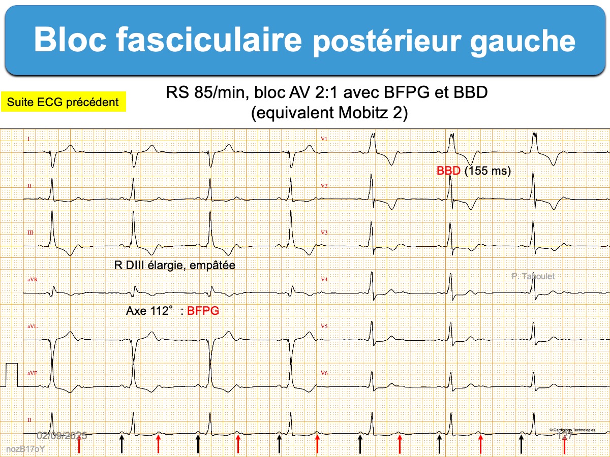 Chez un patient symptomatique ou si ce bloc bifasciculaire est associé à un BAV 1 (P-R ≥ 210 ms) ou – a fortiori – un BAV 2 Mobitz 1, ce bloc bifasciculaire doit faire évoquer la possibilité d’un bloc trifasciculaire, de pronostic plus sévère. Des explorations complémentaires peuvent alors utiles pour en préciser le pronostic (cf. ECG endocavitaire) [2].