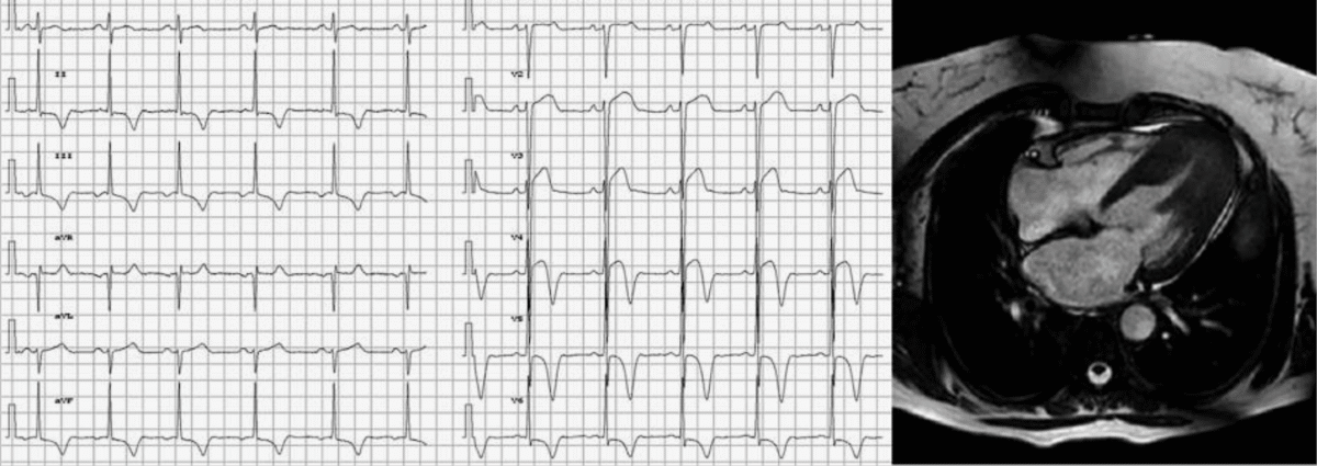 L’ECG est évocateur dans la majorité des cas, l’échographie est plus précise, mais le gold standard est l’IRM. Il est exceptionnellement normal (AHA 2000 [1] ESC 2014 [2] et revue 2023 [14]).