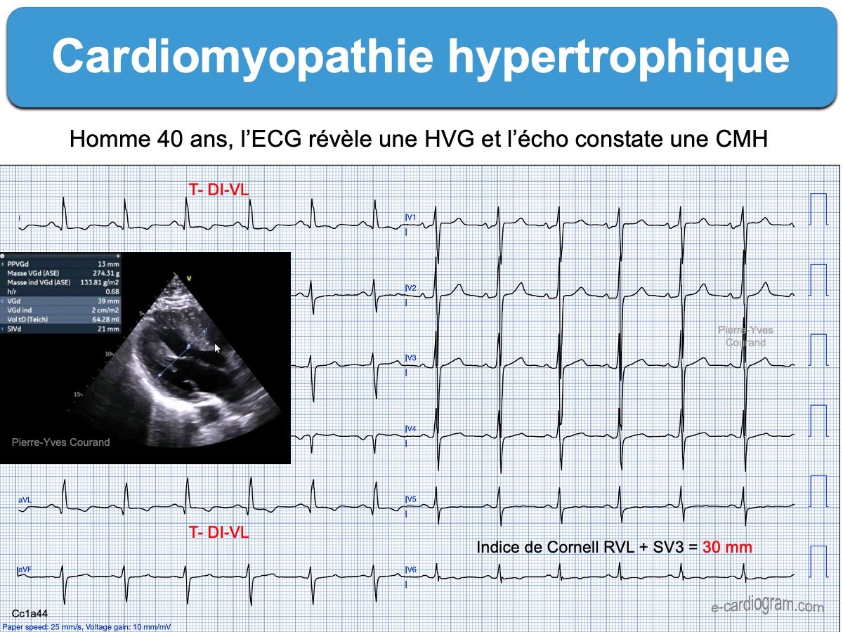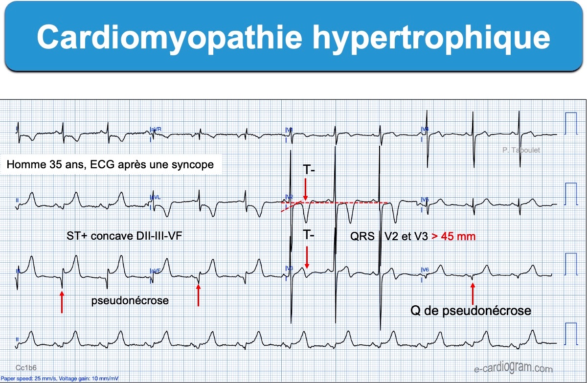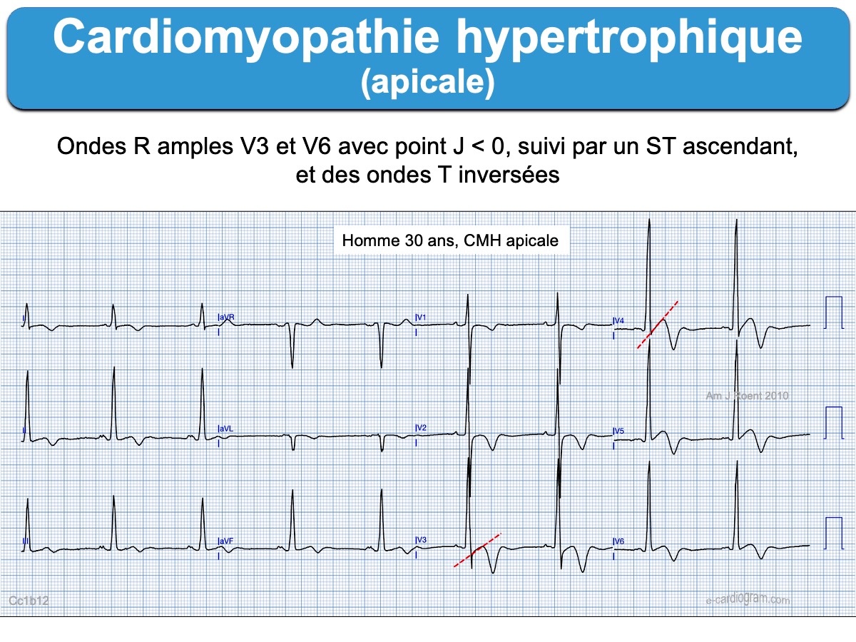 - L’ECG est évocateur en cas d’ondes T inversées géantes (souvent > 10 mm ou 1 mV) dans les dérivations précordiales ou inféro-latérales, en regard de grandes ondes R discrètement élargies. Dans ces dérivations, le segment ST débute souvent en dessous de la ligne de base, puis il est ascendant, à l’inverse des HVG de surcharge volumétrique (HTA rétrécissement aortique…). L’onde T inversée se termine légèrement positivement.