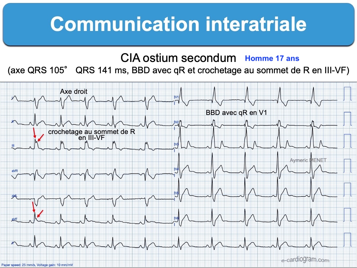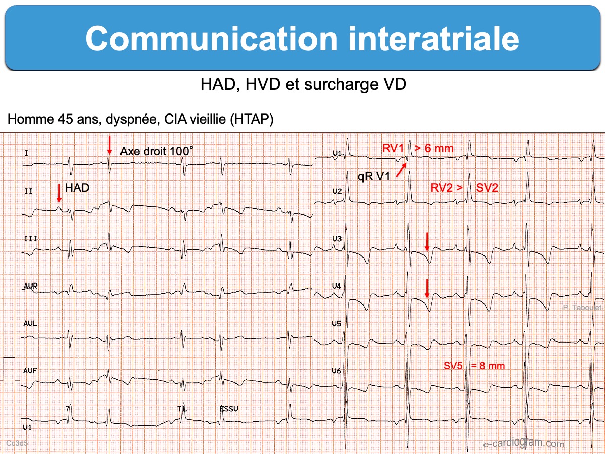 - Ils associent, de façon variable et non spécifique, un axe droit des QRS (ostium secundum) ou un axe gauche (ostium primum) et des signes d’hypertrophie ventriculaire droite parfois impressionnants : retard droit avec onde R ample > 6 mm et tardive en V1 (ou qR) et surcharge ventriculaire droite secondaire à l’hypertension artérielle pulmonaire (ondes T inversées en precordium droit V1-V3).