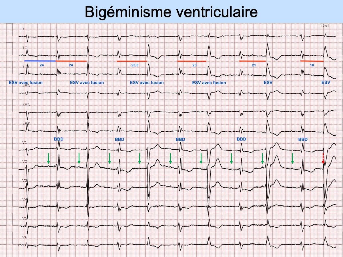 Autre exemple : 6 ESV bigéminées tardives. Au début, la fusion entre les ESV retard gauche et le BBD est maximum et normalise le QRS (l’activation simultanée des deux ventricules par chacun des influx affine le QRS). Puis le couplage des ESV avec le QRS précédant diminue, alors la fusion s’atténue puis disparait et les ESV apparaissent dans leur totalité. Le dernier QRS large n’est pas précédé par une onde P et ne peut donc être qu’une ESV.