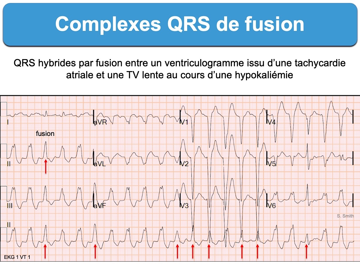 - ou fusion d’un QRS issu d’une dépolarisation du VD par une ESV issu du VD (et donc ESV avec retard gauche en V1) avec ‘un QRS sinusal + BBD.