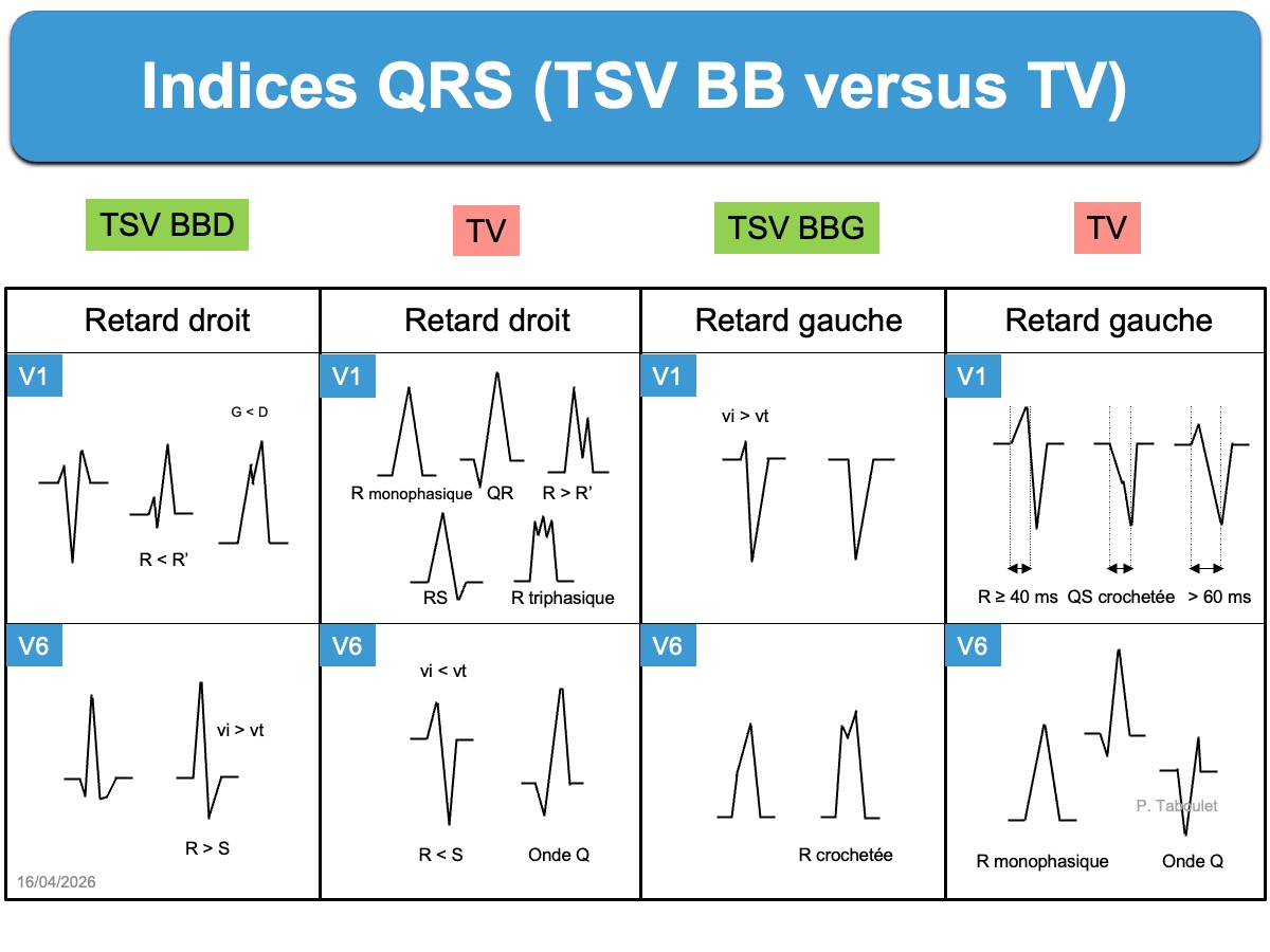 À l’inverse, les complexes QRS ectopiques ventriculaires présentent le plus souvent une déflexion initiale élargie (lente) et déformée en rapport avec une dépolarisation initiée au sein d’un ventricule, plus ou moins loin des voies rapides de conduction du faisceau de His (cf. complexes QRS ectopiques). De nombreux indices morphologiques permettent de les distinguer (cf. Indices de TV, Algorithmes de TV).