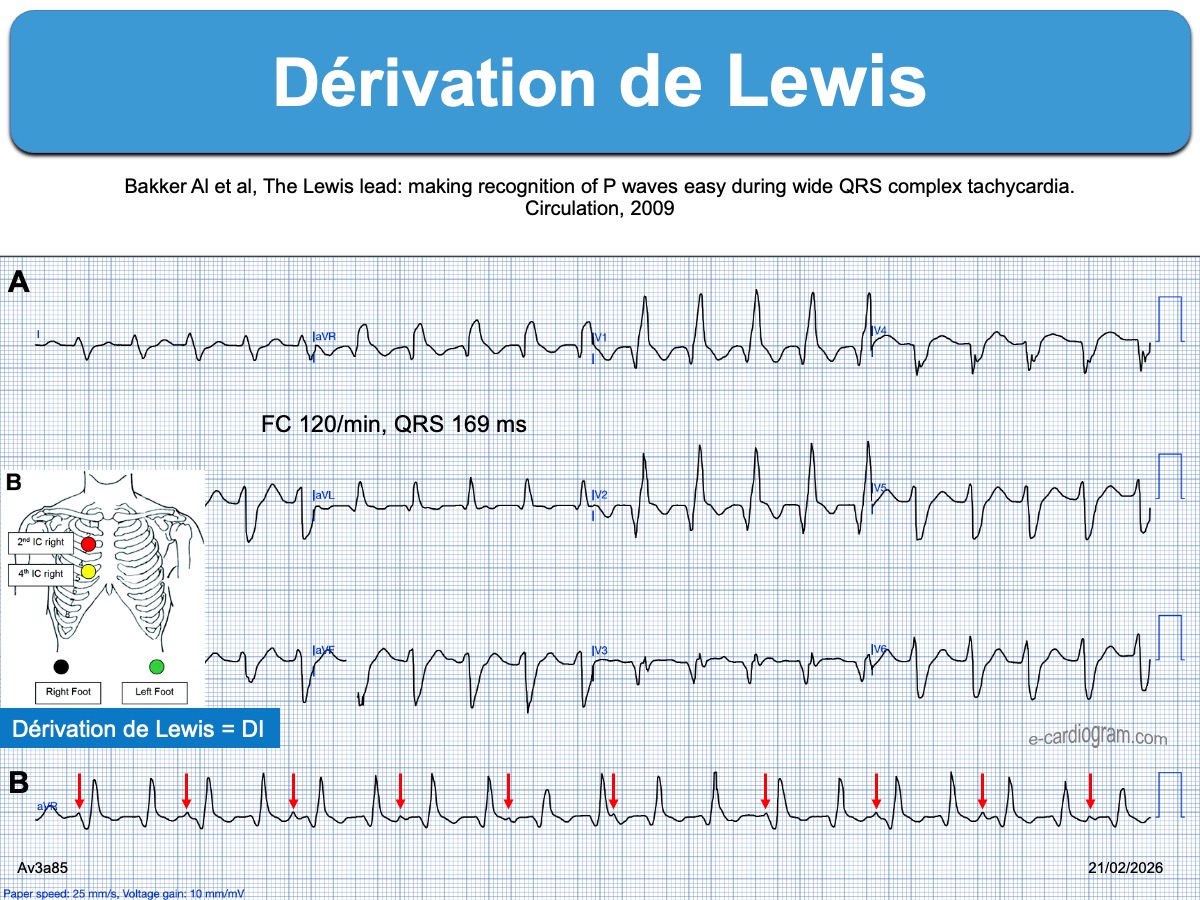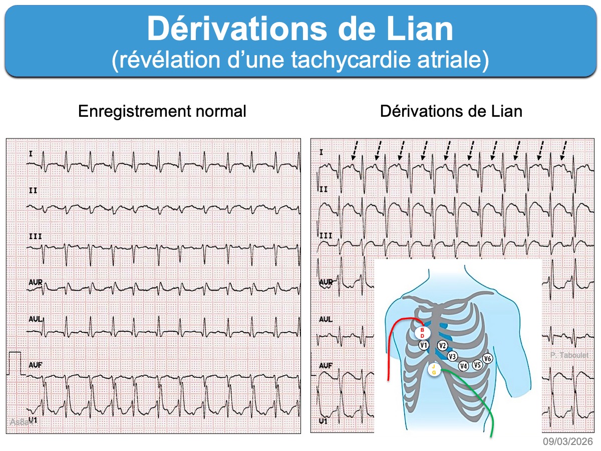 Dérivations obtenues à partir d’une position particulière des électrodes des membres pour mieux visualiser une activité atriale et en particulier une dissociation AV au cours d’une tachycardie à QRS larges (Lian ou Lewis), une onde epsilon au cours d’une cardiomyopathie du VD arythmogène (Fontaine) ou pour réduire des artéfacts (Khan ou Lund) (mise au point [1]).