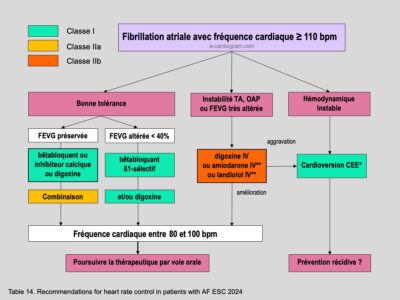 • une combinaison de bétabloquant ou inhibiteur calcique non dihydropyridine avec la digoxine est raisonnable quand la fréquence cardiaque de repos ou d’effort n’est pas suffisamment contrôlée : (Classe IIa).