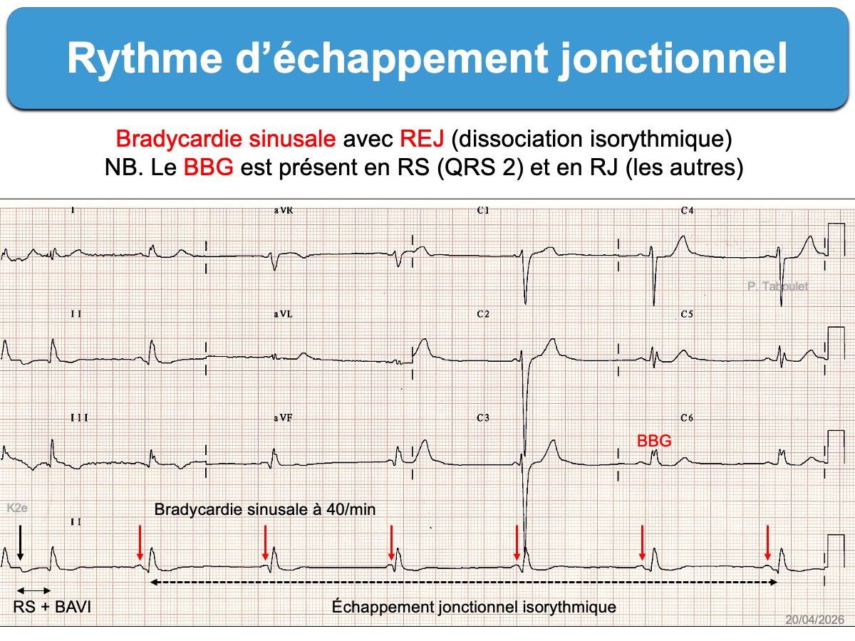 L’exemple type est celui d’une bradycardie sinusale en compétition avec un rythme d’échappement jonctionnel ou ventriculaire. Les ondes P s’inscrivent avec une fréquence proche de celle des QRS mais ne sont pas responsables de la dépolarisation ventriculaire comme le suggère un intervalle PR trop court par instant ou un PR qui se raccourcit progressivement. Il y a donc dissociation AJ ou AV, sans BAV complet et le rythme atrial finit le plus souvent par capturer le rythme (cf. Wandering pacemaker). Le traitement est celui de la bradycardie sinusale… Si nécessaire.