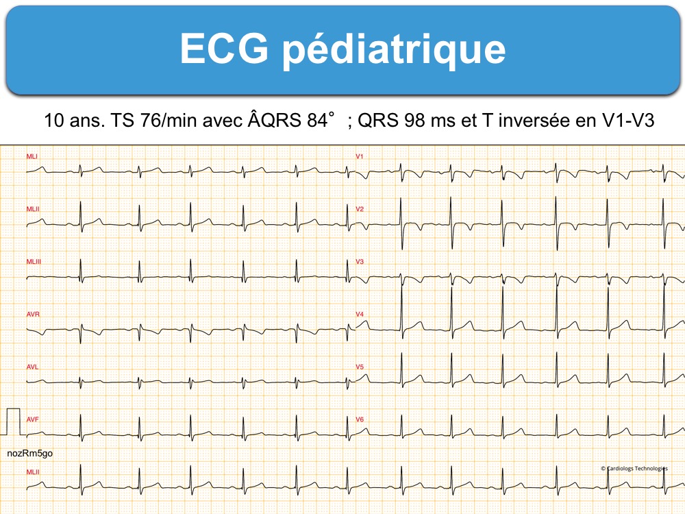 - Les ECG du nouveau-né, de l’enfant et de l’adulte jeune présentent des différences notables avec ceux de l’adulte. Il peut s’agir d’une tachycardie en bas âge, d’une arythmie sinusale prononcée, de QRS plus fins, d’un ÂQRS droit, d’une onde R ample > 6 mm en V1, ou encore d’anomalies juvéniles de repolarisation au niveau des dérivations V1-V3(V4) (cf. ECG pédiatrique).