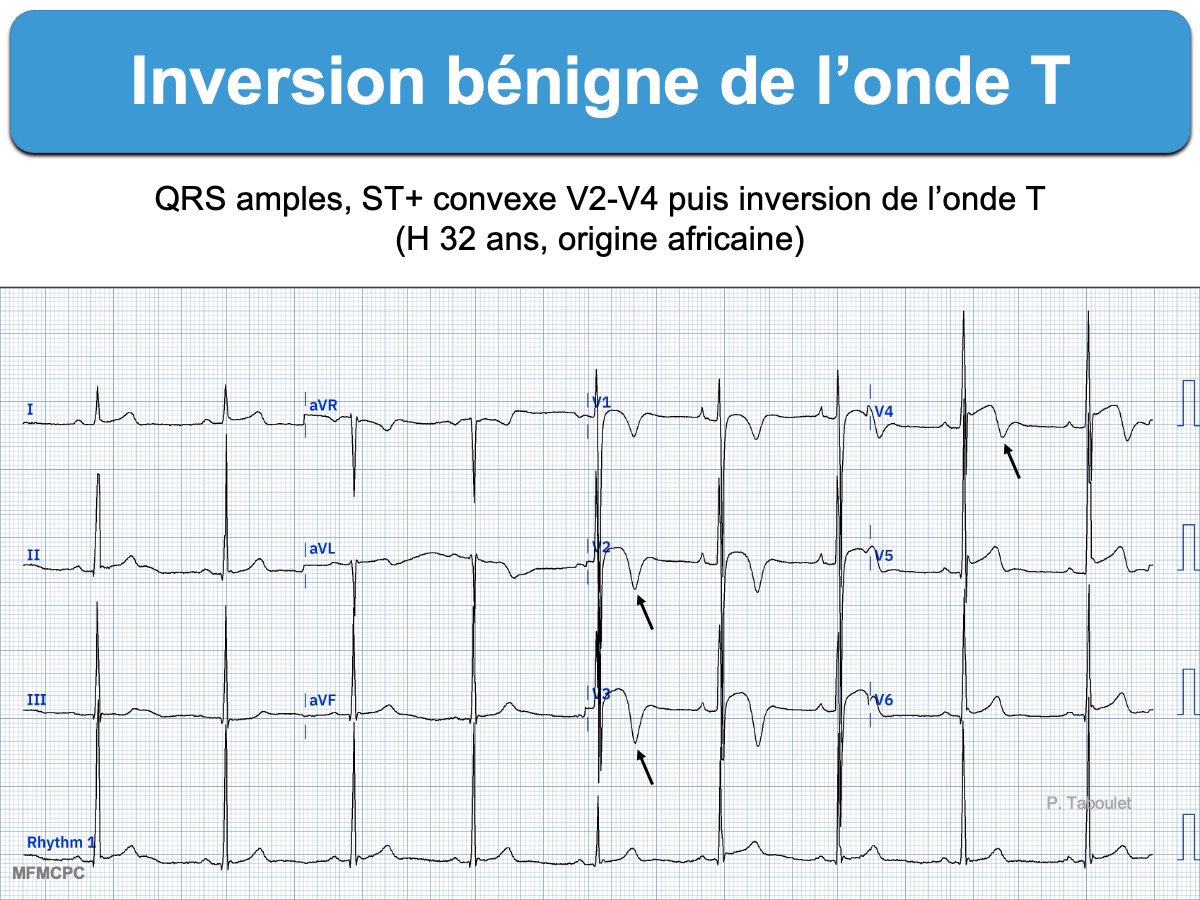 - Un sus-décalage de ST convexe (« en dôme ») associé à une onde T diphasique à convexité proximale en V1-V4 est assez caractéristique du grand sportif d’origine africaine ou afro-caribéenne (« black athlete repolarization variant » voir ECG figure 5 dans [5]), mais la bénignité est souvent assurée par une échocardiographie (cf. Inversion bénigne de l’onde T) [10][11].