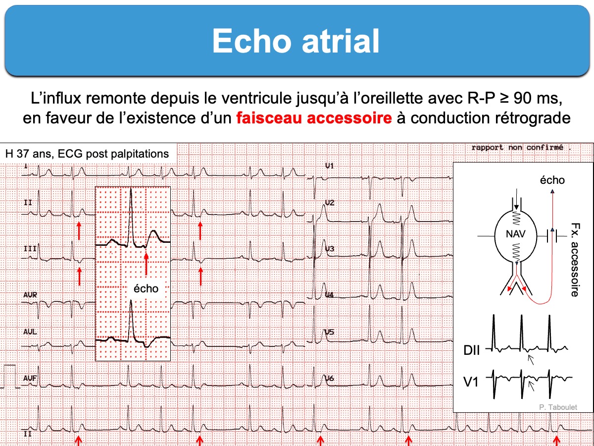 Des échos atriaux se traduisent par une onde P rétrograde (négative en DII-VF) qui suit certains complexes QRS à une distance R-P fixe laquelle dépend du mécanisme de la réentrée et donc de la distance à parcourir jusqu’à l’oreillette. Ce couplage R-P est généralement < 90 ms en cas de réentrée intranodale slow-fast (plus fréquente), > 90 ms en cas de réentrée par faisceau accessoire et elle est >> 90 ms en cas de réentrée intranodale fast-slow (Cf. Tachycardie nodale).