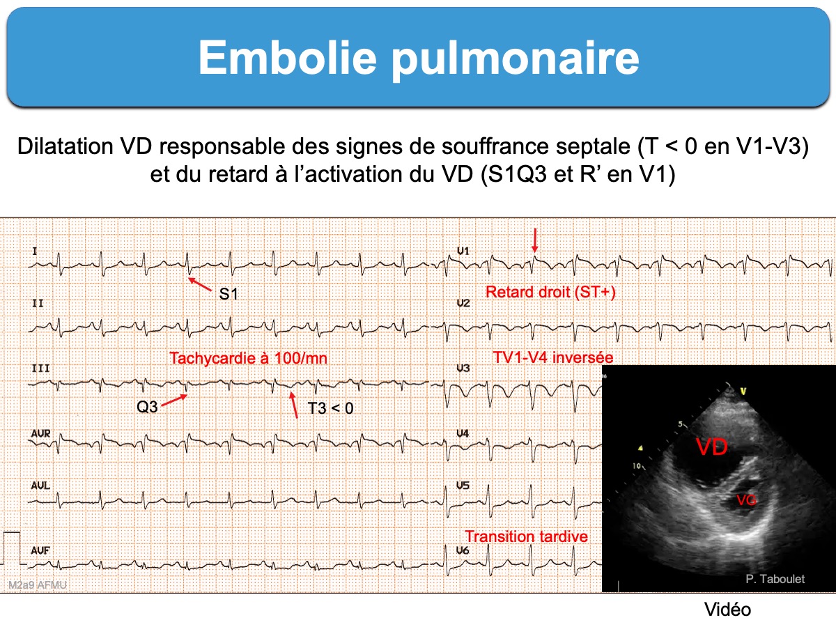 Il faut souvent se contenter d’une fréquence cardiaque accélérée (pas forcément > 100/min) et d’un ou deux signes ECG évocateurs de souffrance septale ou de dextrorotation ou une modification des tracés ECG précédents pour renforcer une hypothèse d’embolie pulmonaire.