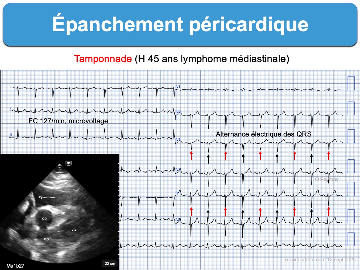 - Une alternance électrique des QRS (changement bigéminé de taille et d’axe des QRS). Voir aussi [4].