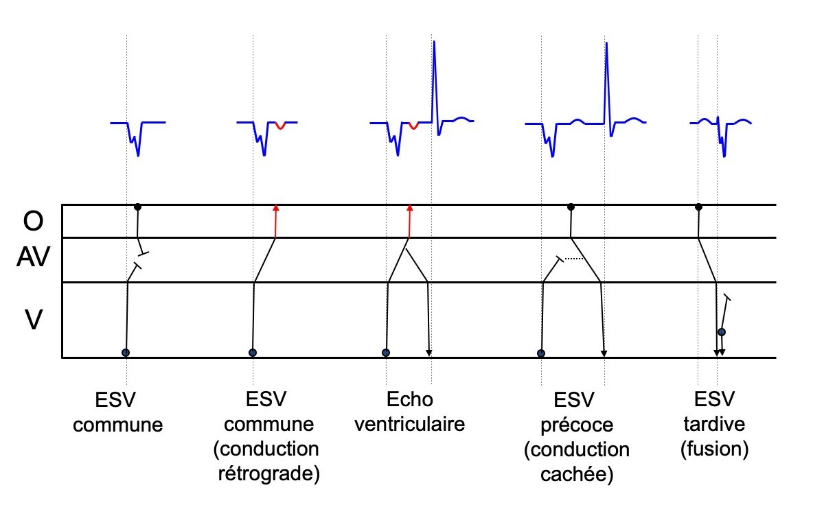Activité ventriculaire prématurée, originaire du myocarde ventriculaire et parfois du faisceau de His ou des fibres de Purkinje (ESC 2022 et 2025 [1], livre [2]). L’influx dépolarise les ventricules de proche en proche et remonte par voie rétrograde vers le nœud AV, via les fibres de Purkinje et le faisceau de His. Il peut y rester bloqué ou gagner les oreillettes qu’il dépolarise de façon rétrograde.