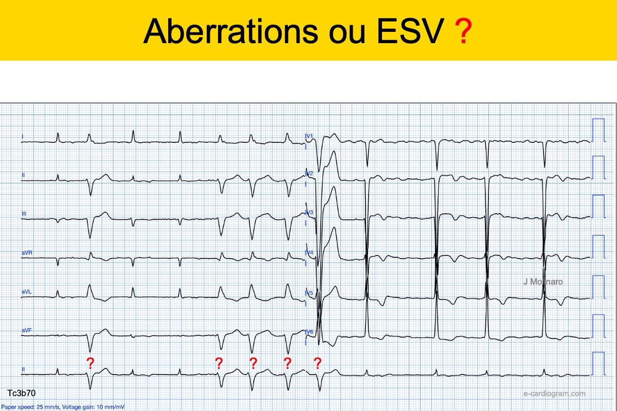 - Une aberration ventriculaire suite à une ESA bloquée partiellement dans le faisceau de His (cf. ESA (ou ESJ) conduite avec aberration ventriculaire)