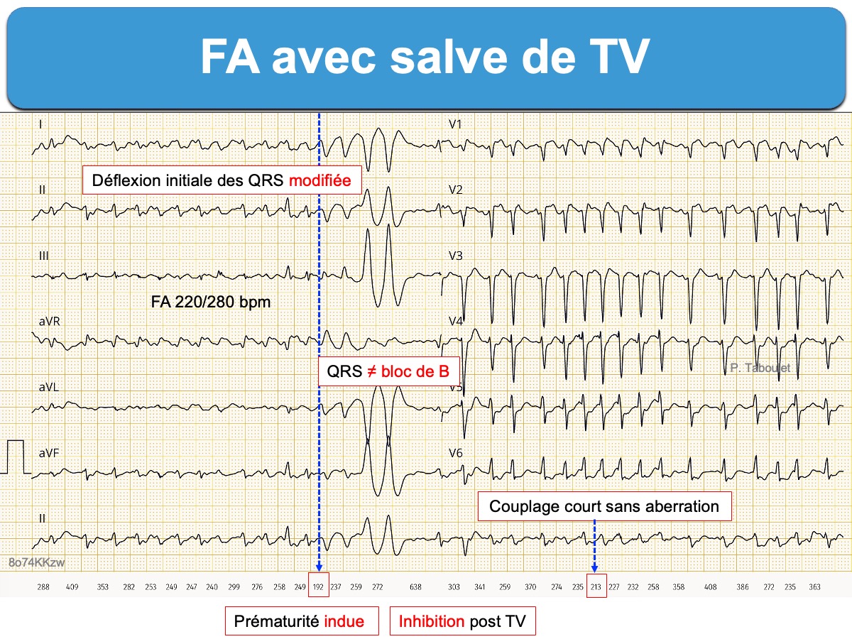- après une salve de QRS larges irréguliers, il existe une pause avant la reprise des QRS fins (car inhibition et réinitialisation)