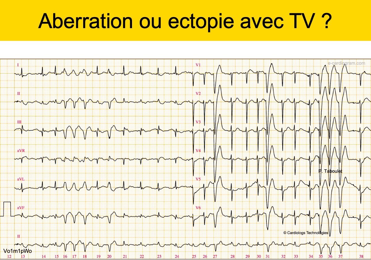 Les aberrations de conduction sont un artéfact physiologique fréquent et bénin, alors que les ectopies ventriculaires, en particulier les salves de tachycardies ventriculaires non soutenues (TVNS), sont rares mais signes d’un automatisme anormal qui peut être de mauvais pronostic.
