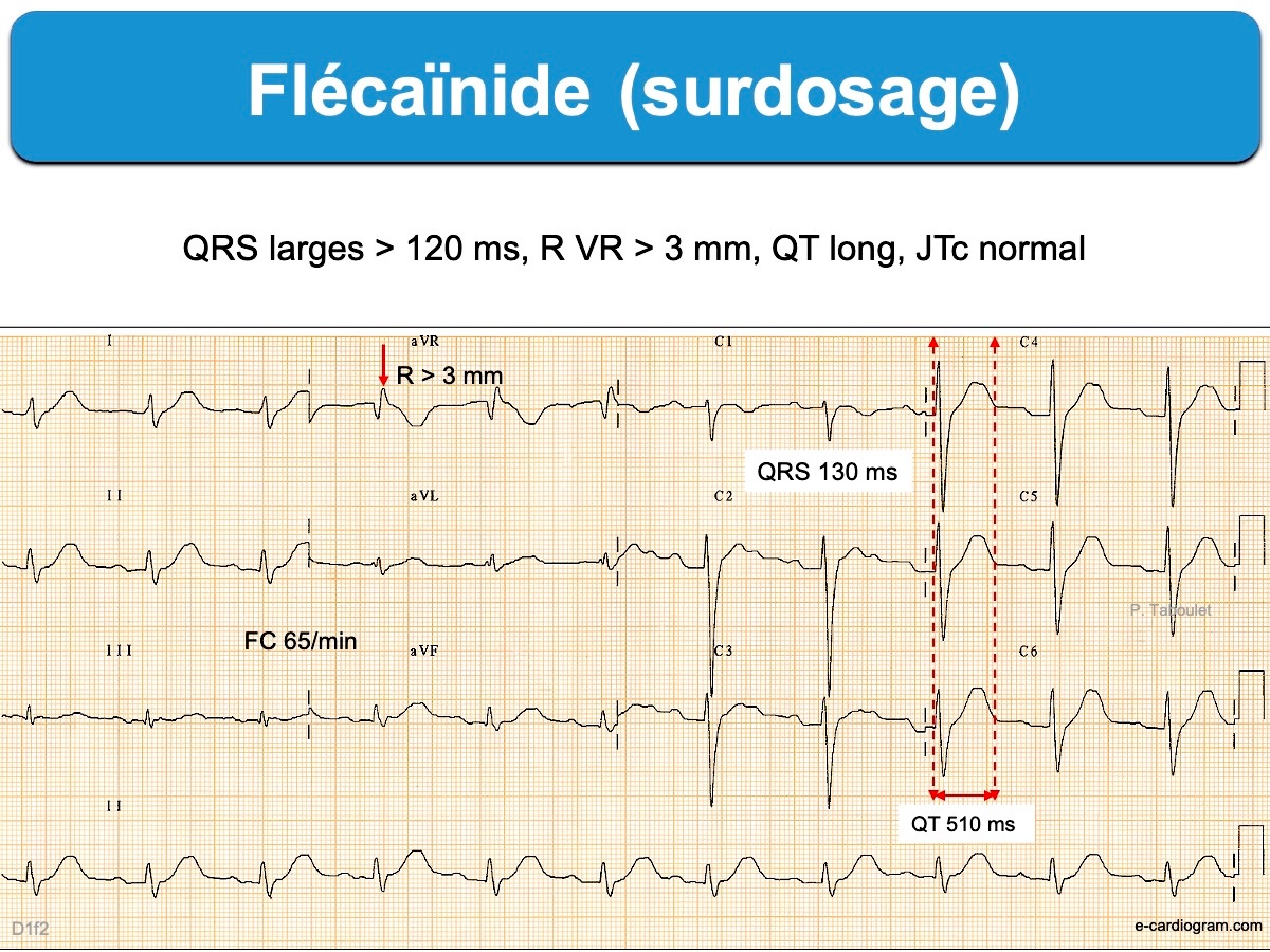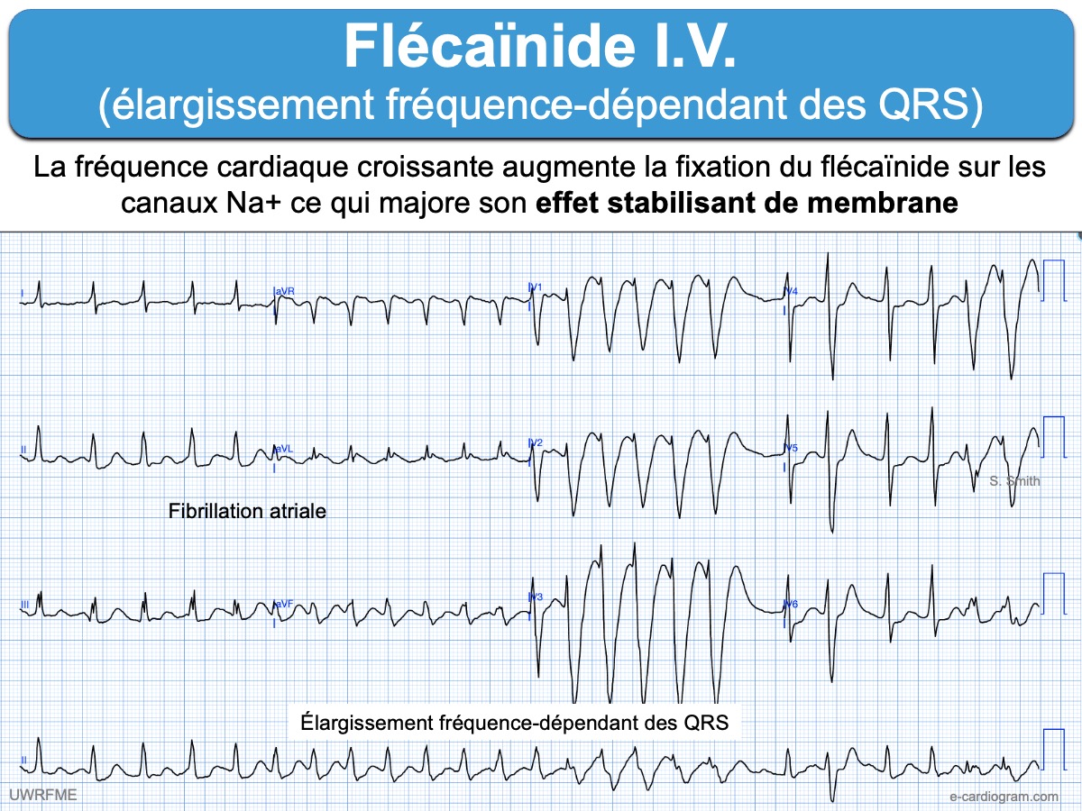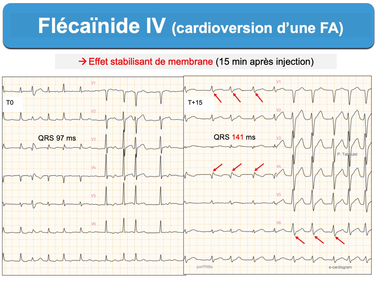 - Un élargissement du complexe QRS supérieur à 25% des valeurs de base amènera à réduire la posologie. Ci-dessous. L’effet stabilisant de membrane devient toxique. Arrêt de la flécaïnide et administration de sels de sodium IV