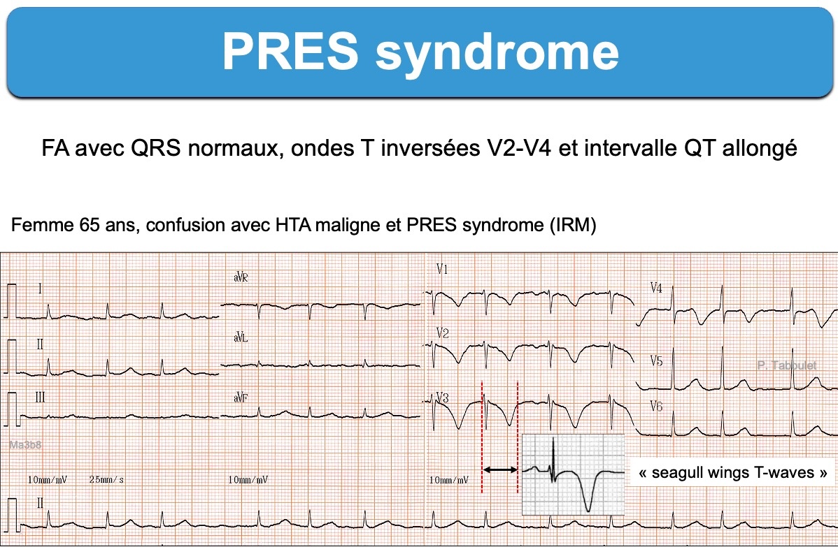 1. Les ondes T inversées profondes avec un intervalle QT long sont parfois appelées « ondes T cérébrales » dans un contexte clinique évocateur (« cerebrovascular accident pattern » [2] ou CNS T-waves). Elles ne sont pas sans rappeler des ondes T ischémiques, comme on les observe parfois dans un syndrome coronaire aigu résolutif ou un tako-tsubo [5] et qui ressemblent à des ailes de mouette (T wave in “seagull”, Raimundo Barbosa-Barros).