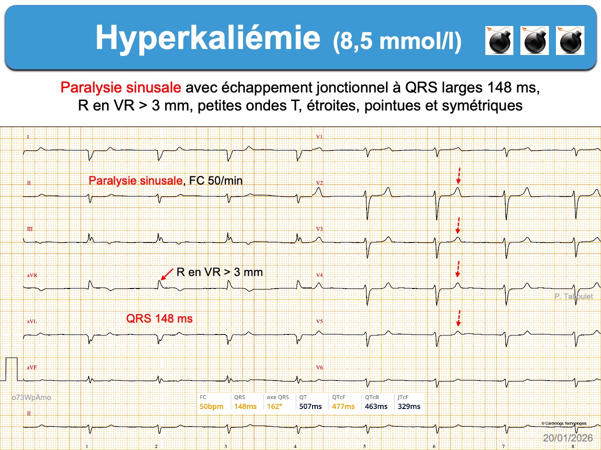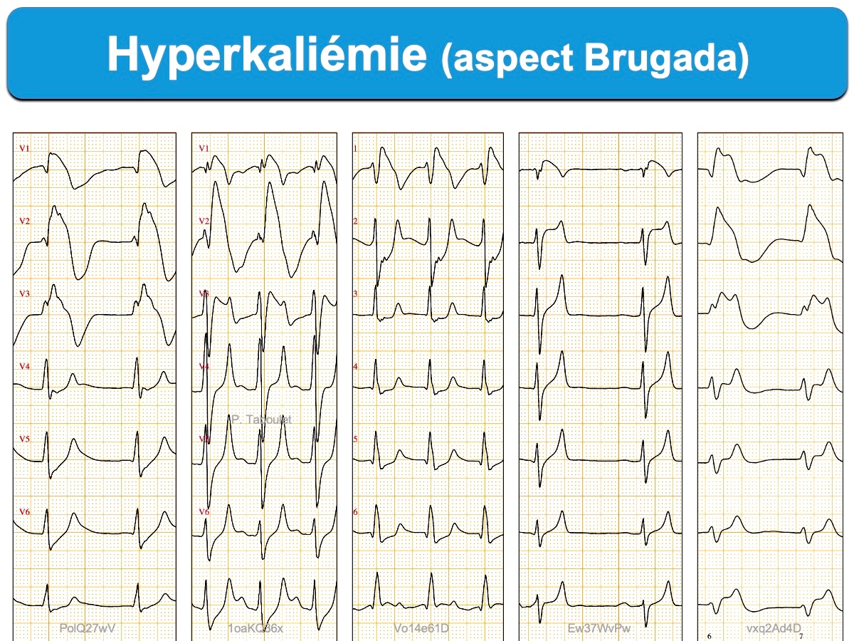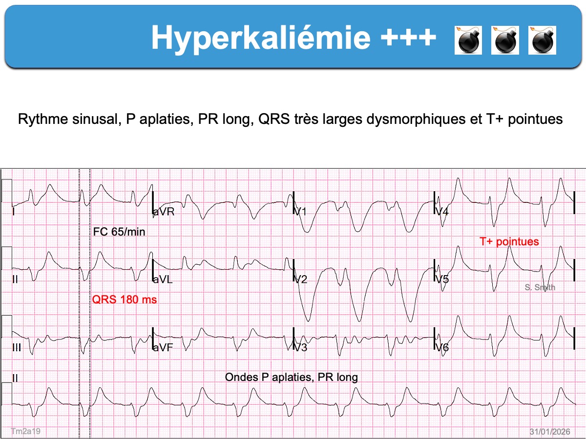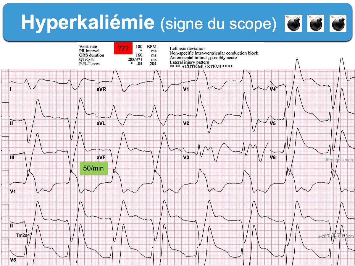 On compare parfois l’hyperkaliémie avec la syphilis du cœur, tant les aspects ECG sont variés. Certains signes sont particulièrement évocateurs d’hyperkaliémie critique en raison du risque à court terme d’arythmie ventriculaire fatale par asystole ou fibrillation ventriculaire. Oui, l’hyperkaliémie tue parfois « sans attendre » (cf. YouTube L’ECG métabolique).