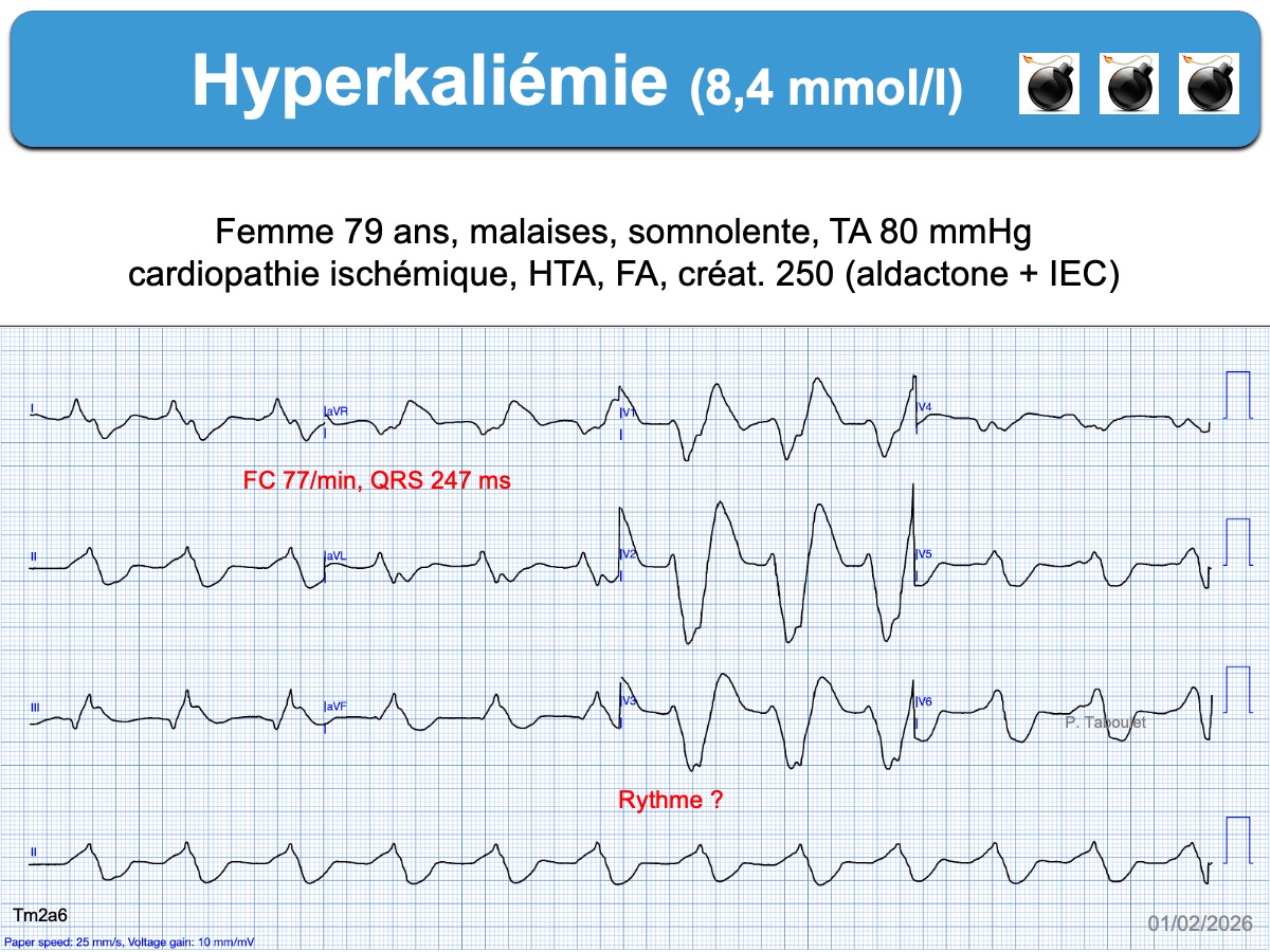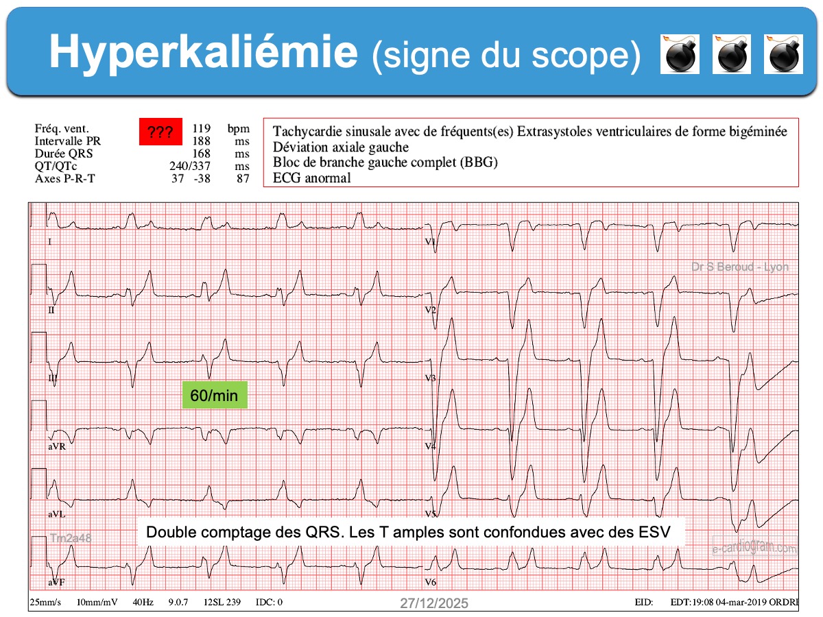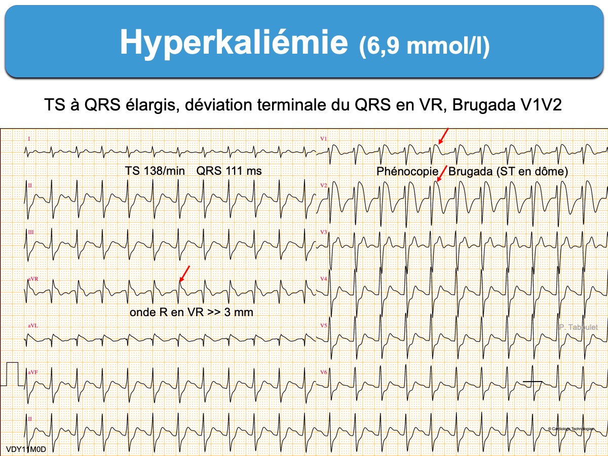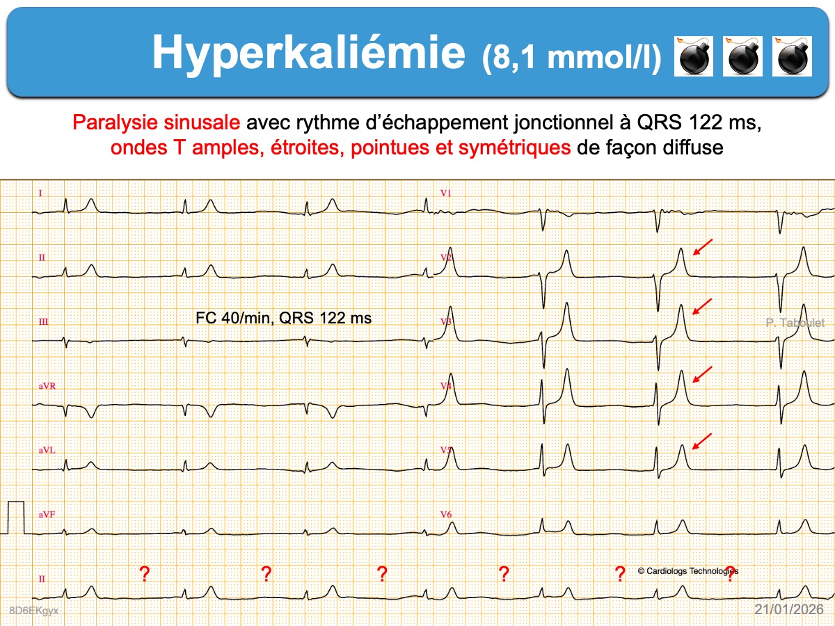 On compare parfois l’hyperkaliémie avec la syphilis du cœur, tant les aspects ECG sont variés. Certains signes sont particulièrement évocateurs d’hyperkaliémie critique en raison du risque à court terme d’arythmie ventriculaire fatale par asystole ou fibrillation ventriculaire. Oui, l’hyperkaliémie tue parfois « sans attendre » (cf. YouTube L’ECG métabolique).