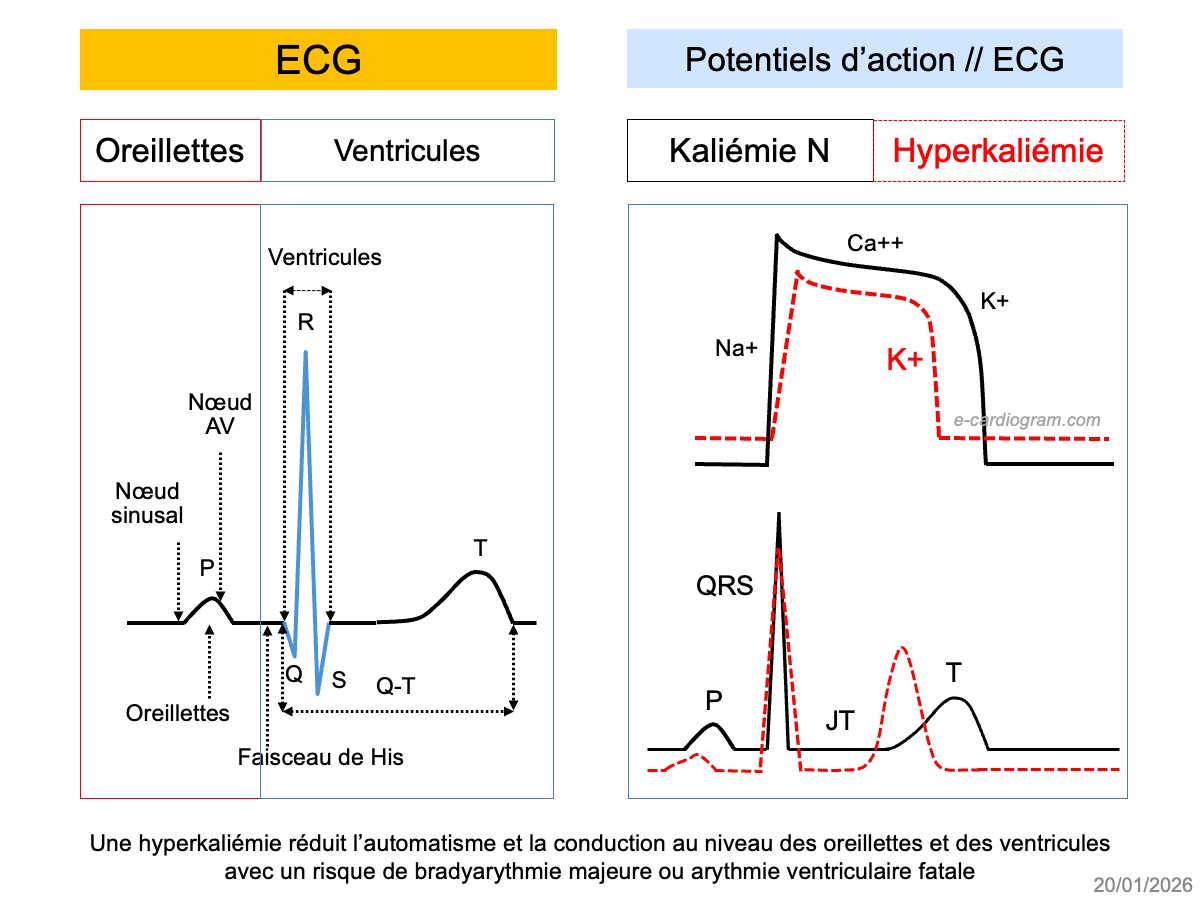 L’élévation du potassium dans le milieu extracellulaire accélère la phase 3 du potentiel d’action des myocytes, dépendante essentiellement des canaux potassiques [2], ce qui modifie la repolarisation ventriculaire.