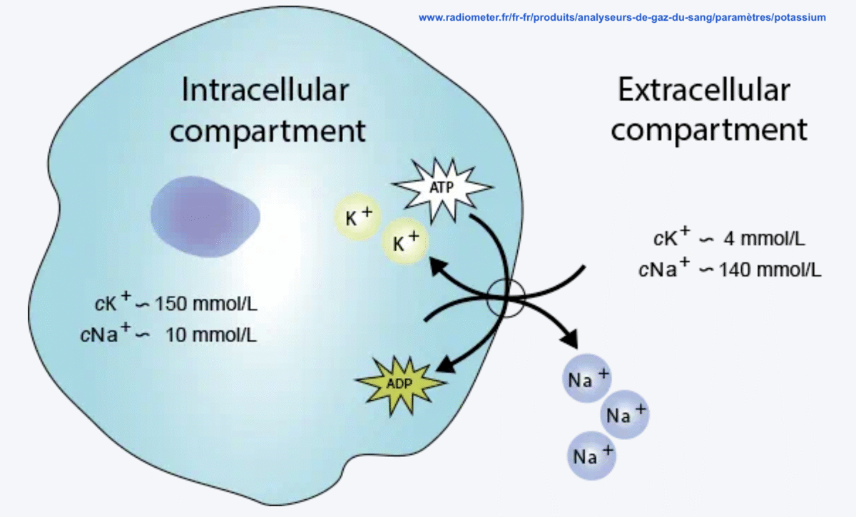 Rappel. Le potassium est présent dans le corps à 98% dans le milieu intracellulaire (principalement les muscles squelettiques) et 2% dans le milieu extracellulaire. Le plasma en contient très peu (3,5-5 mmol/l) comparé au milieu intracellulaire (140-150 mmol/l). Il est principalement éliminé par les reins.