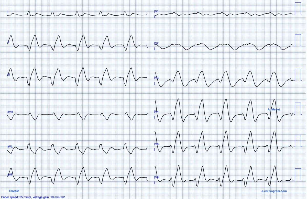 - TSV à QRS larges. Il peut s’agir d’une tachycardie sinusale ou atriale. Le tracé peut mimer une TV (cf. Hyperkaliémie traitement).