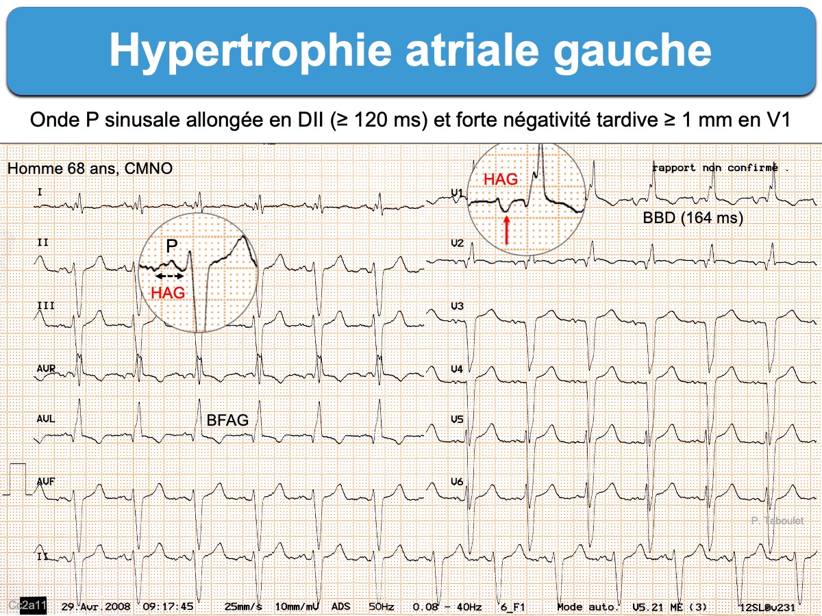 - En DII. Une onde P sinusale allongée dont la durée est ≥ 120 ms (3 petits carreaux horizontaux ou 3 mm en étalonnage 10 mm = 1 mV). L’onde PDII est souvent bifide avec une deuxième double bosse ≥ 40 ms (AHA 2009 [1]). Néanmoins, une anomalie de conduction intra-atriale peut donner une prolongation similaire de l’onde P (Cf. Bloc inter-atrial) [1][3]. Pour cette raison, le terme de left atrial abnormality est préféré au terme hypertrophie/dilatation par les auteurs américains [1][3]. D’autres anomalies de l’onde P ont été rapportées comme une déviation axiale gauche de P de 15° vers la gauche ou de la portion/force terminale de P [3].