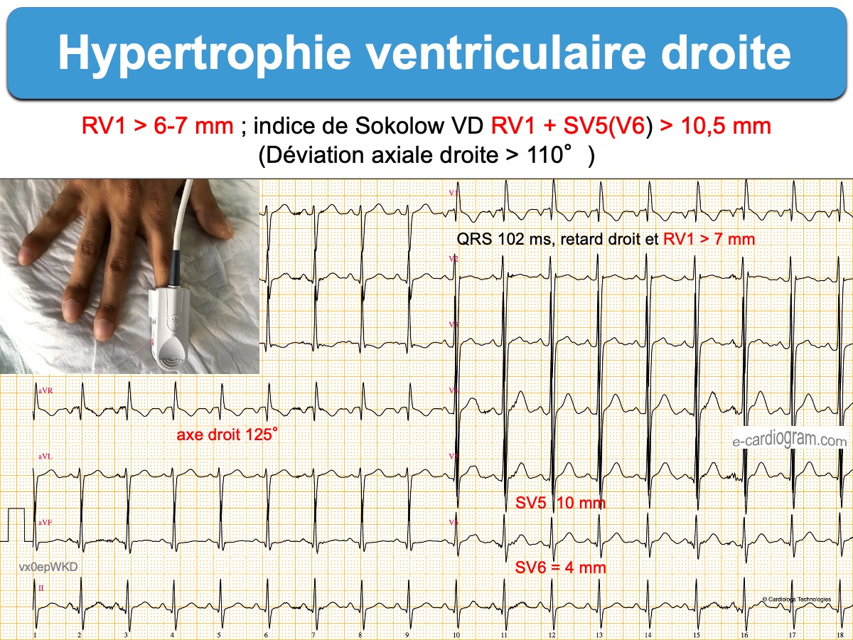 L’hypertrophie/dilatation du VD amplifie et prolonge les vecteurs de dépolarisation ventriculaire droite, ce qui :déplace l’axe électrique du cœur (normalement orienté à gauche, en bas et en arrière) vers la droite et en avant (développement antérieur droit) ou en arrière (développement postérieur droit) et amplifie l’amplitude des ondes R en regard du ventricule droit (dérivation V1-V2) et celle des ondes S en regard du ventricule gauche (dérivations V5-V6).