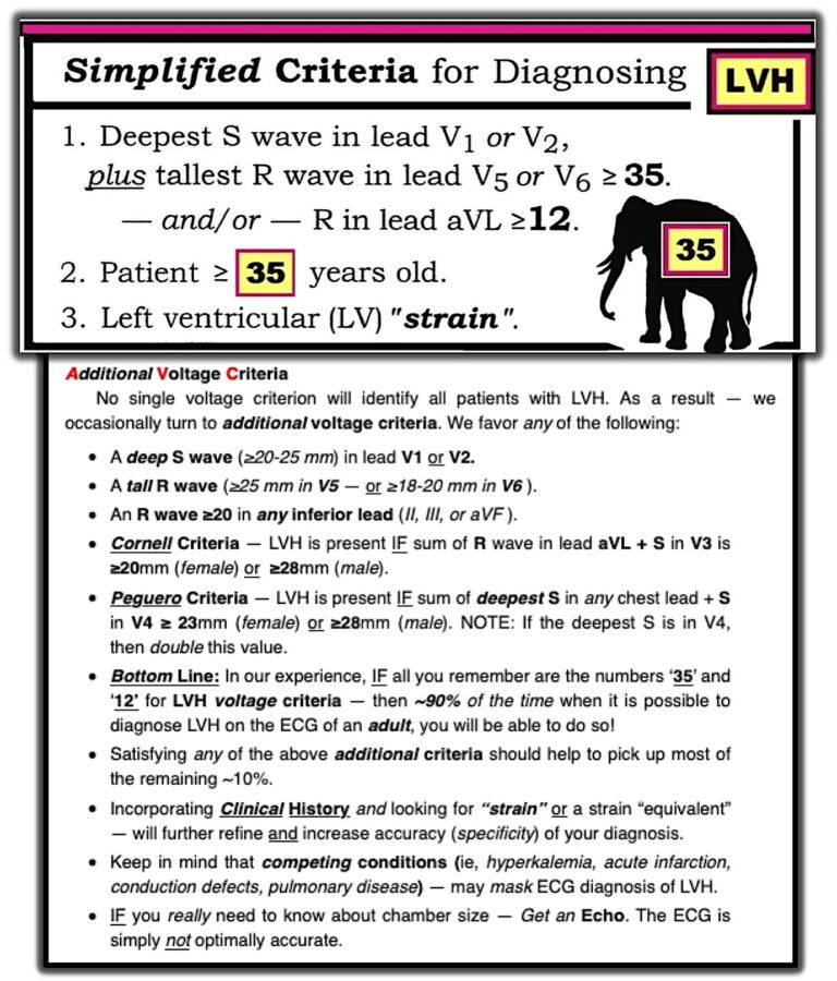 L’hypothèse d’une hypertrophie ventriculaire gauche échographique doit être envisagée en présence d’un seul indice d’amplitude monodérivation (en exigeant une amplitude adaptée à l’âge et au sexe), mais l’hypothèse sera plus forte en présence de plusieurs indices d’amplitude (monodérivation ou combinés) et surtout si des signes associés indirects sont présents en particulier chez les sujets jeunes masculins chez qui les complexes QRS peuvent être hypervoltés. Il s’agit d’une hypertrophie atriale gauche, une déviation axiale gauche ou un BFAG, une surcharge ventriculaire gauche (strain pattern) ou des complexes QRS élargis ≥ 110 ms.