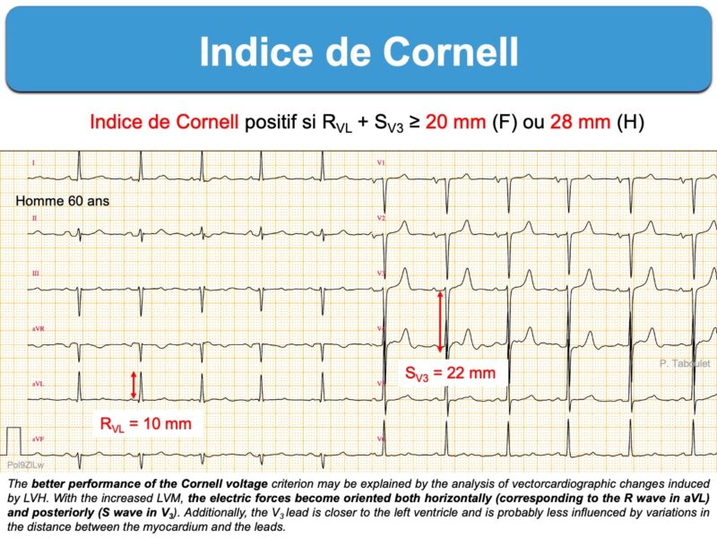 L’indice de Cornell est positif lorsque la somme des amplitudes de RVL + SV3 est > 20 mm chez la femme ou > 28 mm chez l’homme (24 mm chez l’homme hypertendu blanc) [1][2].