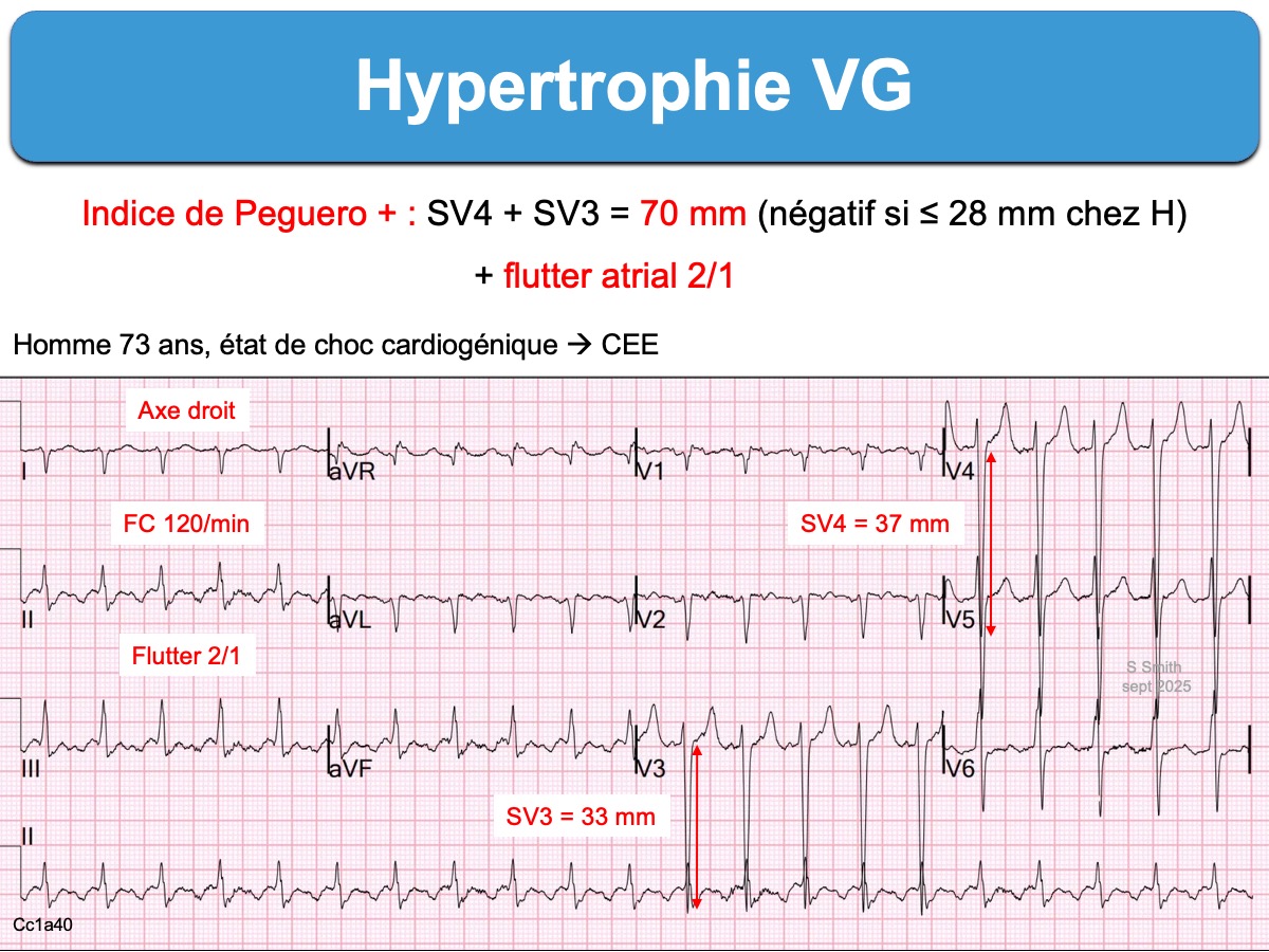L’indice de Peguero vient donc enrichir la liste des indices d’HVG pour le dépistage de l’HVG, en particulier dans les populations à risque du fait de l’âge ou de l’HTA, quand les indices classiques sont négatifs ou douteux (cf. Indice de Cornell, Indice de Sokolow).