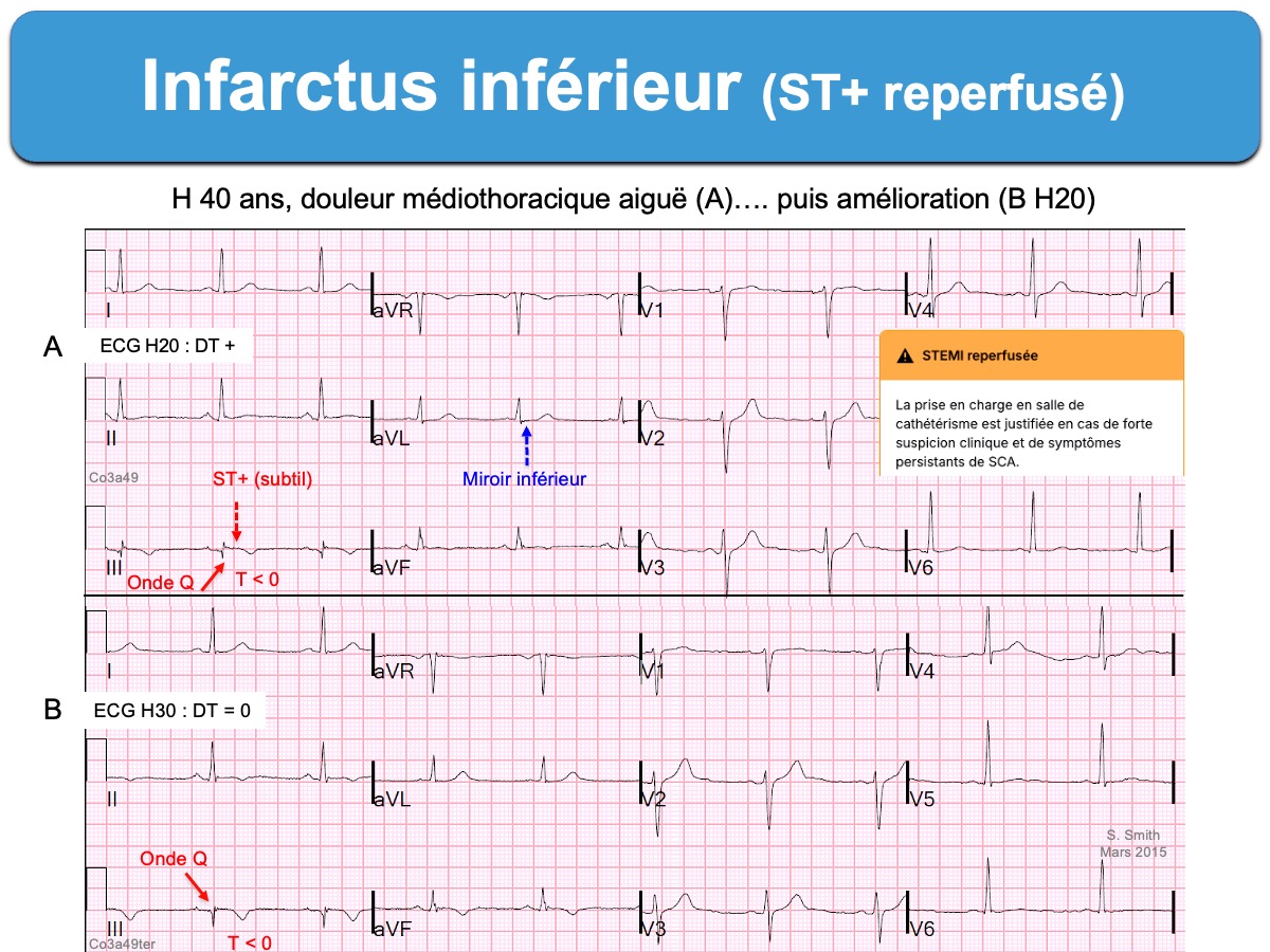 - Le ST+ peut être subtil en phase de résolution de l’ischémie mais parfois aussi en phase avancée de l’infarctus : les QRS sont anormaux, rabotés ou peu voltés, avec des ondes Q, un ST+ à peine discernable en D3/VF avec un miroir en VL et des ondes T diphasiques ou inversées. Cette présentation correspond à une reperfusion coronaire. Elle est souvent mal interprétée alors qu’elle correspond à un « STEMI reperfusé » ou un « équivalent STEMI » si les ondes T restent positives.