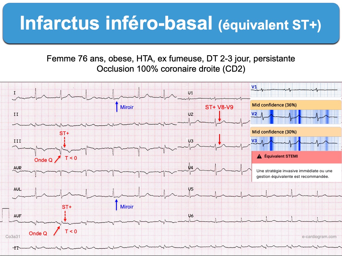 L’expression électrique d’un infarctus ST+ isolé au territoire inférieur est généralement facile à identifier. Mais il faut connaitre aussi les formes subtiles non ST+ (cf. Equivalents ST+), celles étendues à d’autres territoires ou compliquées de troubles du rythme, comme la fibrillation atriale, le bloc sinoatrial ou atrioventriculaire, les RIVA et les TV.