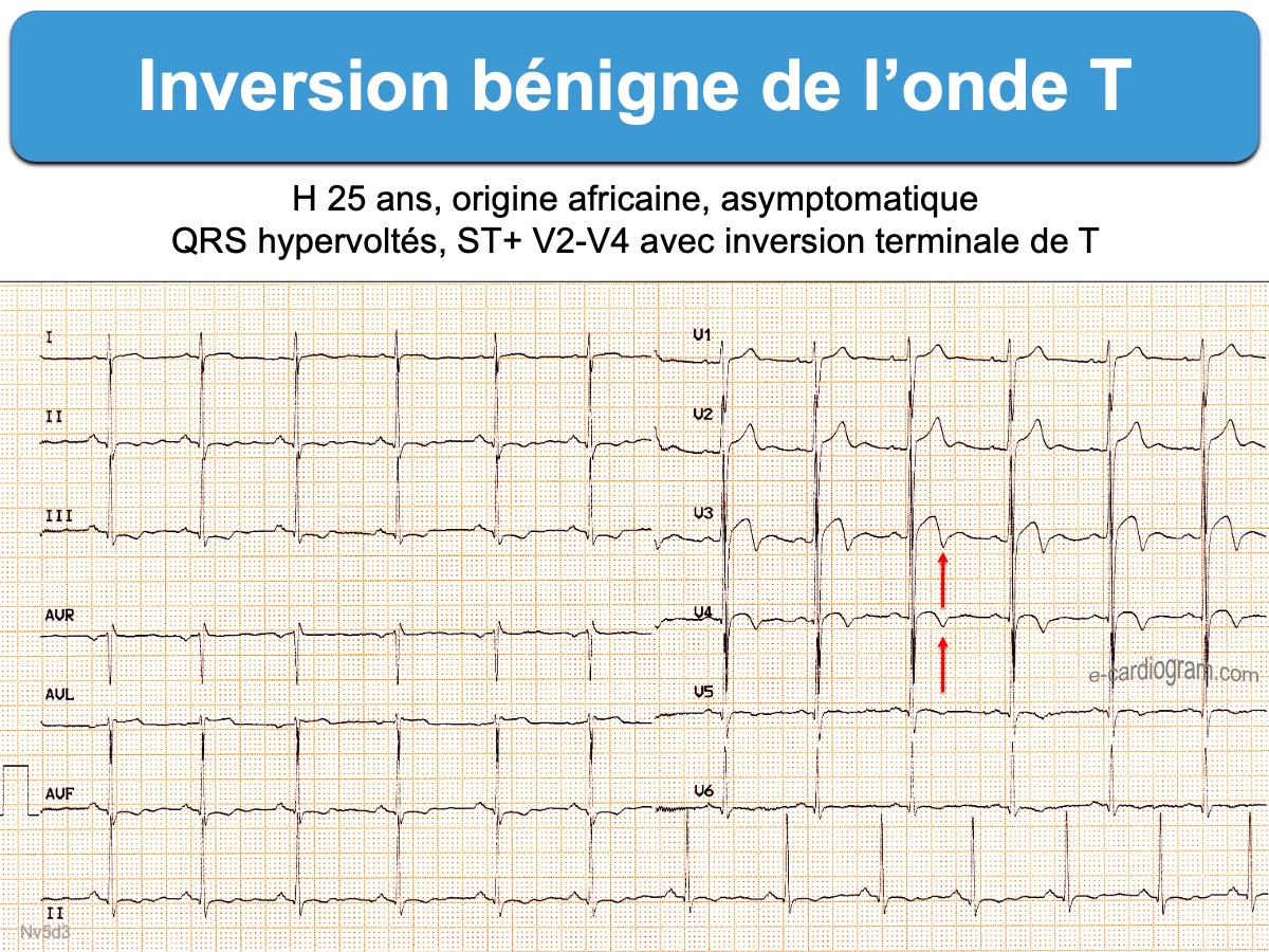 Variante de repolarisation ventriculaire avec inversion terminale de l’onde T qui se rencontre aux USA chez environ 4% des hommes (parfois des femmes) d’origine africaine, plutôt jeunes (« benign T-wave inversion » ou « black repolarization ») en bonne santé [1][2][3]. Elle est exceptionnelle chez les sujets caucasiens (0,5 %) [4].