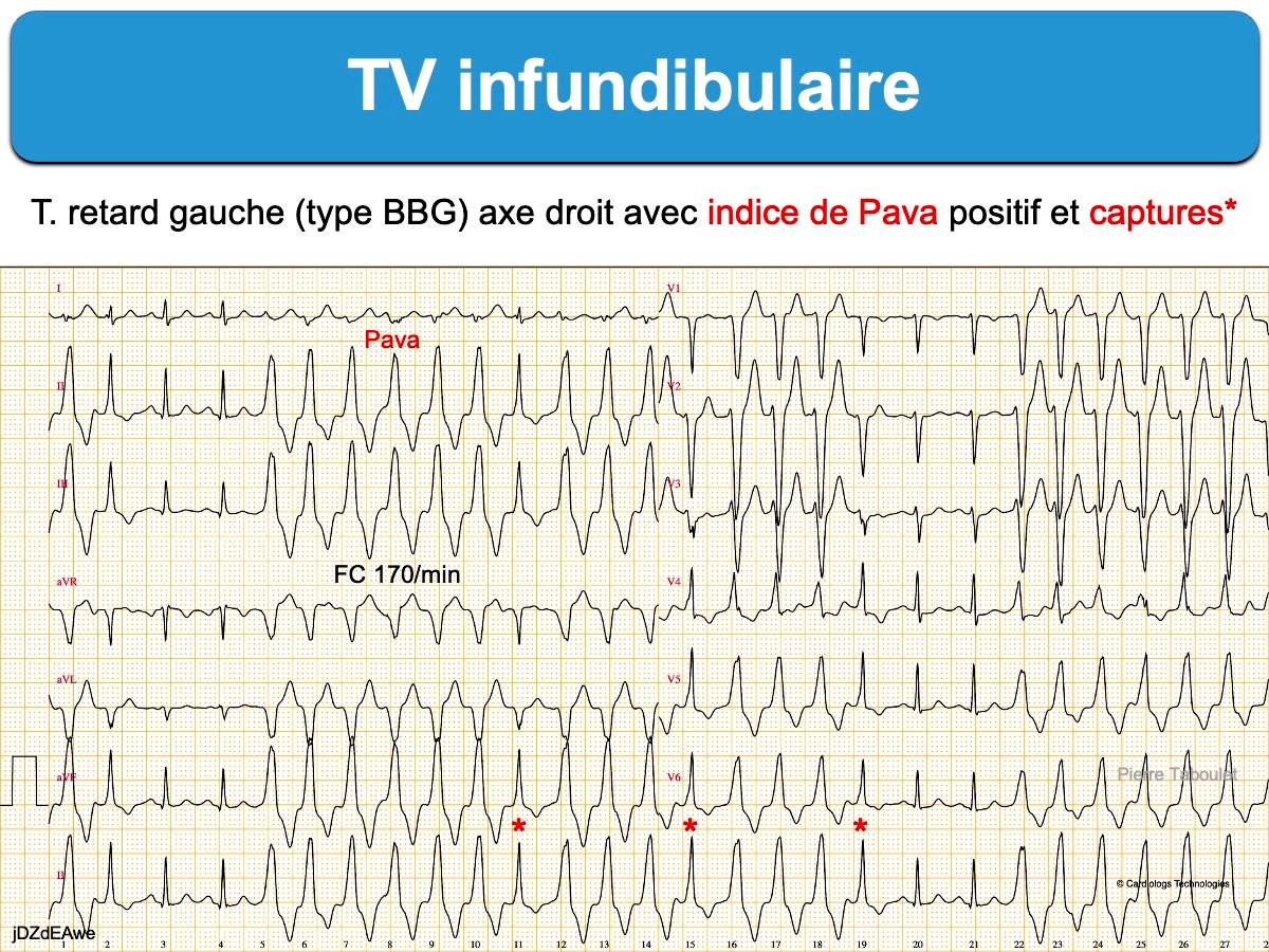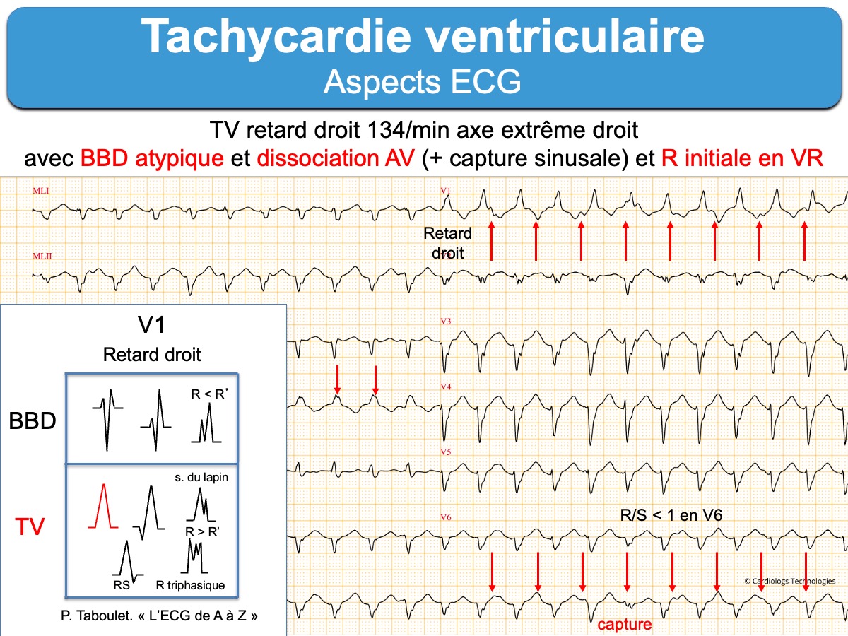 Tachycardie-ventriculaire-TV-droite-134-bpm-et-qrs-148-ms-avec-BBD-atypique-avec-capture-dissociation-ECG-taboulet-aoeeVGoY