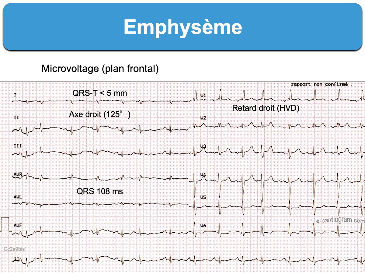 1- Un microvoltage diffus (plans frontal et horizontal) traduit la difficulté à enregistrer les potentiels électriques du fait d’une diminution de la conductance électrique depuis le myocarde jusqu’aux électrodes d’enregistrement. On peut citer trois causes :