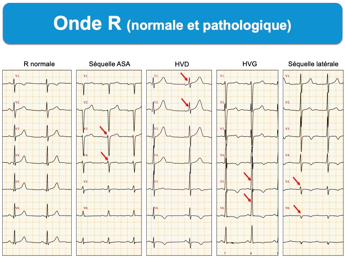 Les valeurs normales d’amplitude et de largeur de l’onde R varient selon l’âge, le sexe, l’ethnie, la morphologie. Des valeurs pathologiques traduisent une anomalie de la qualité du muscle ventriculaire ou de la conduction intraventriculaire sous-jacente.